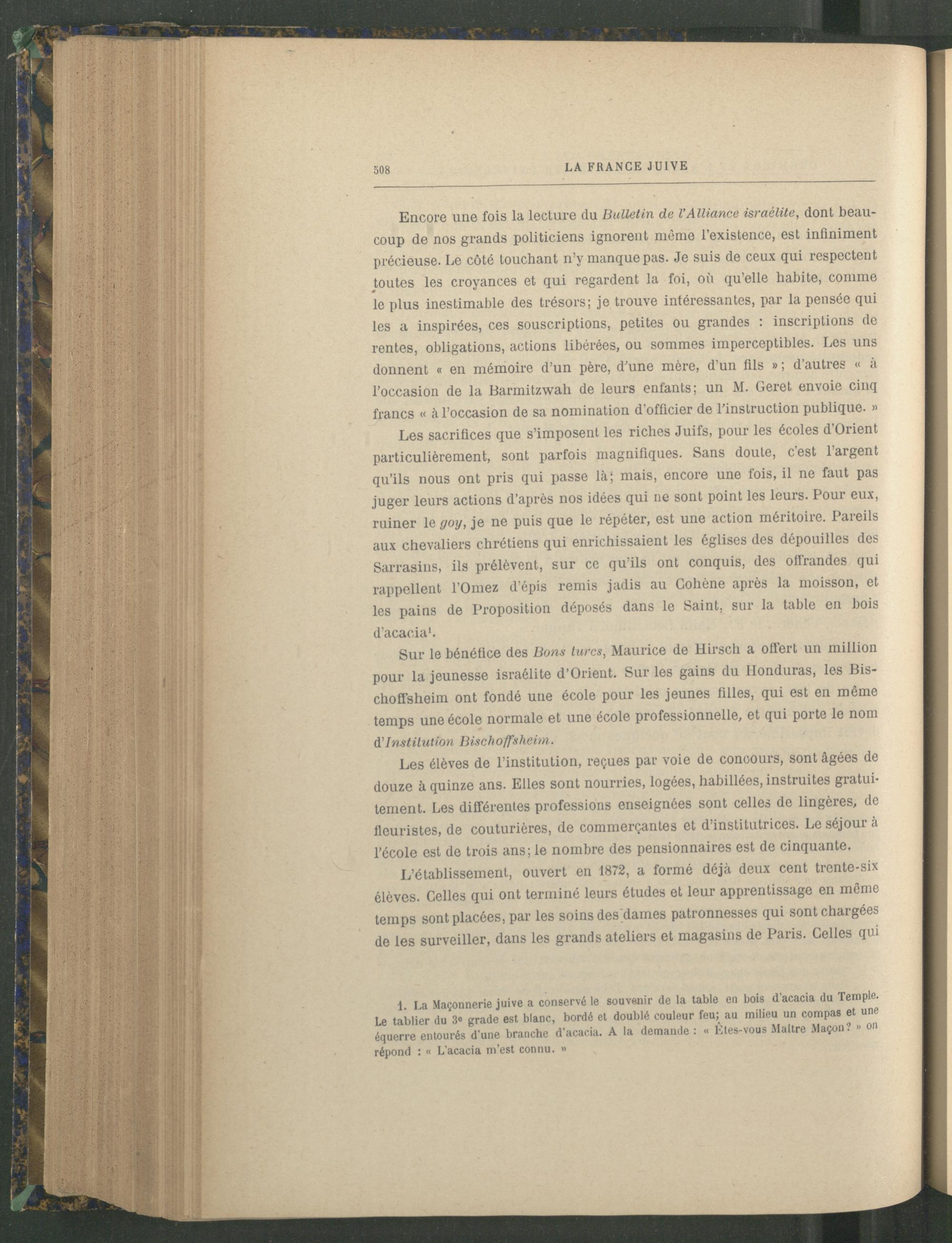 Encore une fois la lecture du Bulletin de l’Alliance Israélite , dont beaucoup de nos grands politiciens ignorent même l’existence, est infiniment précieuse. Le côté louchant n’y manque pas. Je suis de ceux qui respectent toutes les croyances et qui regardent la foi, où qu’elle habite, comme le plus inestimable des trésors; je trouve intéressantes, par la pensée qui les a inspirées, ces souscriptions, petites ou grandes : inscriptions de rentes, obligations, actions libérées, ou sommes imperceptibles. Les uns donnent « en mémoire d’un père, d’une mère, d’un fils » ; d’autres « à l’occasion de la Barmitzwali de leurs enfants; un M. Geret envoie cinq francs « à l’occasion de sa nomination d'officier de l’instruction publique. »