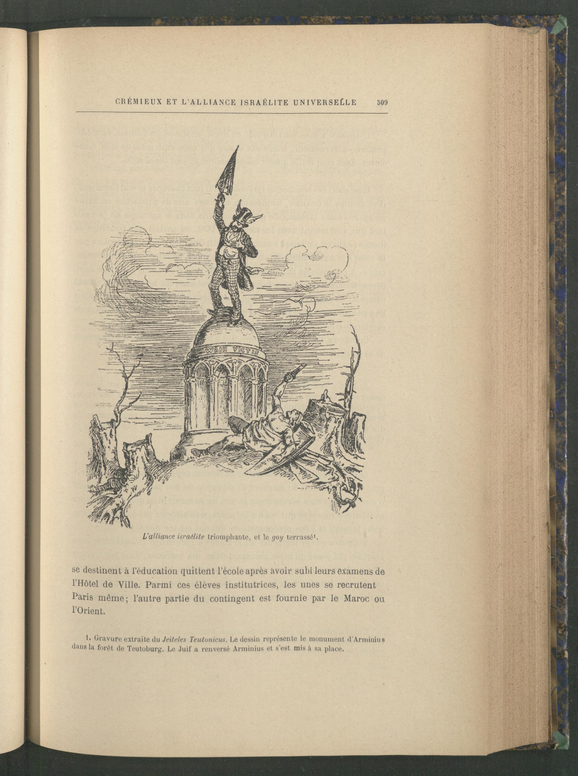 1. Gravure extraite du Jeiteles Teutonicus. Le dessin représente le monument d’Arminius dans la forêt de Teutoburg. Le Juif a renversé Arminius et s’est mis à sa place.