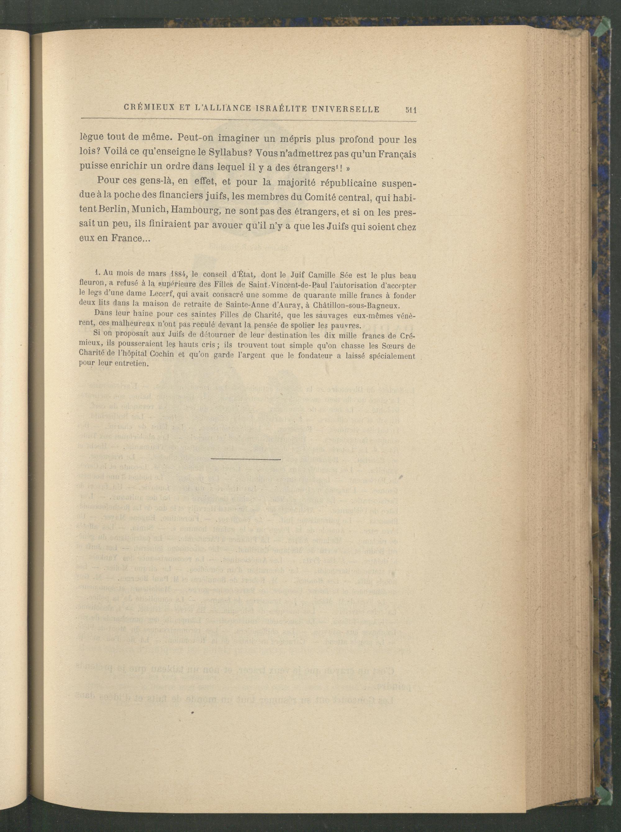 Si on proposait aux Juifs de détourner de leur destination les dix mille francs de Cré- mieux, ils pousseraient les hauts cris ; ils trouvent tout simple qu’on chasse les Sœurs de Charité de l’hôpital Cochin et qu’on garde l’argent que le fondateur a laissé spécialement pour leur entretien.