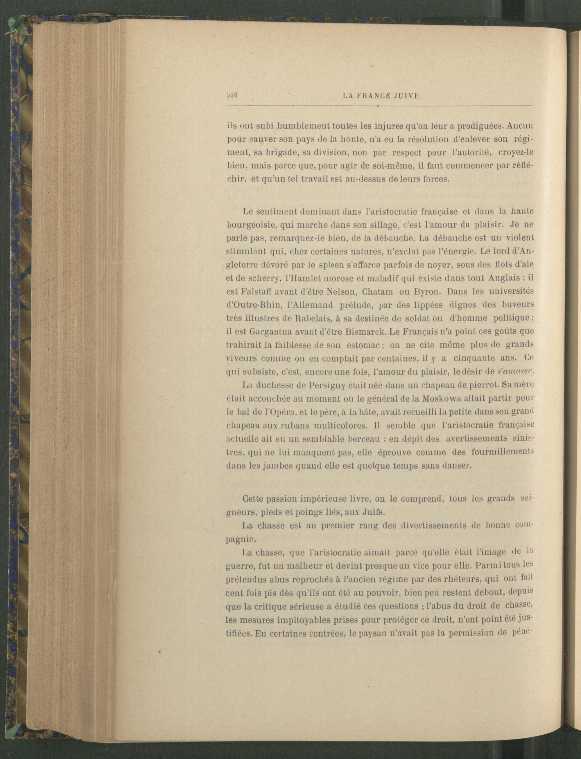 Le sentiment dominant dans l'aristocratie française et dans la haute bourgeoisie, qui marche dans son sillage, c’est l’amour du plaisir. Je ne parle pas, remarquez-le bien, de la débauche. La débauche est un violent stimulant qui, chez certaines natures, n’exclut pas l’énergie. Le lord d’Angleterre dévoré par le spleen s’efforce parfois de noyer, sous des Ilots d’ale et de scherry, l'Hamlet morose et maladif qui existe dans tout Anglais ; il est Falstall avant d’être Nelson, Chatam ou Byron. Dans les universités d’Outre-Ilhin, l’Allemand prélude, par des lippées dignes des buveurs très illustres de Rabelais , à sa destinée de soldat ou d’homme politique ; il est Gargantua avant d’être Bismarck. Le Français n’a point ces goûts que trahirait la faiblesse de son estomac ; on ne cite même plus de grands viveurs comme on en comptait par centaines, il y a cinquante ans. Gc qui subsiste, c’est, encore une fois, l’amour du plaisir, ledésir de «'«muser.