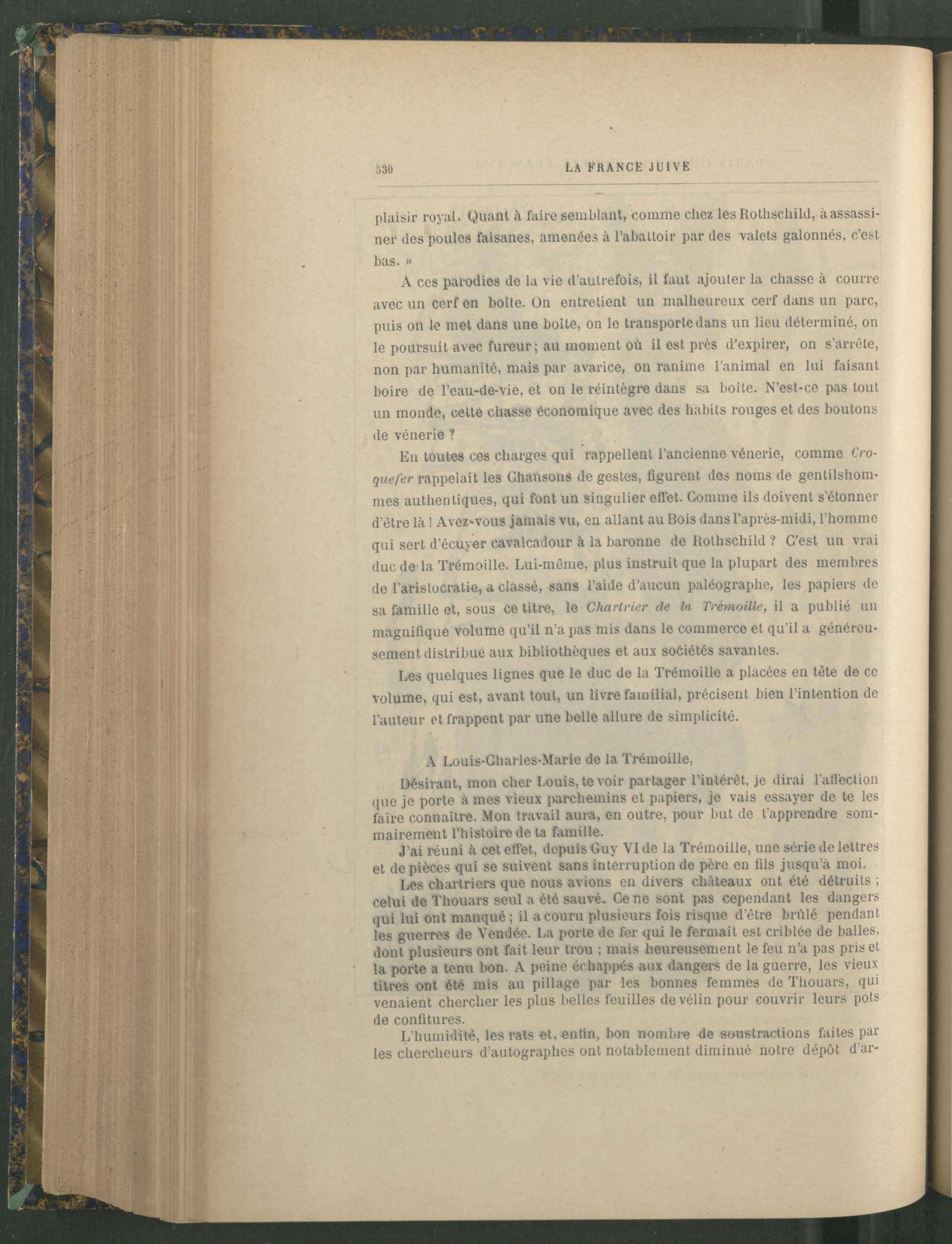Eu toutes ces charges qui rappellent l’ancienne vénerie, comme Croque fer rappelait les Chansons de gestes, figurent des noms de gentilshommes authentiques, qui font un singulier effet. Comme ils doivent s'étonner d étre là ! Avez-vous jamais vu, en allant au Bois dans l’après-midi, l'homme qui sert d’écuyer cavalcadour à la baronne de Rothschild ? C’est un vrai duc de la Trémoille. Lui-mème, plus instruit que la plupart des membres de l'aristocratie, a classé, sans l’aide d’aucun paléographe, les papiers de sa famille et, sous ce titre, le Chartrier de la Trémoille, il a publié un magnifique volume qu’il n’a pas mis dans le commerce et qu'il a généreusement distribué aux bibliothèques et aux sociétés savantes.