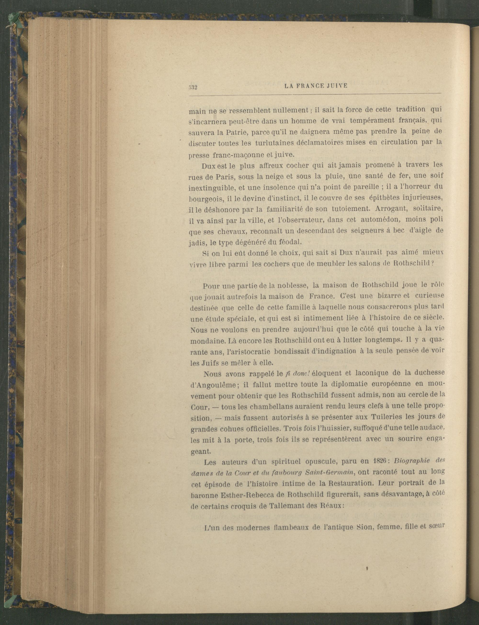 Les auteurs d’un spirituel opuscule, paru en 1826 : Biographie des dames de la Cour et du faubourg Saint-Germain, ont raconté tout au long cet épisode de l’histoire intime de la Restauration. Leur portrait de la baronne Esther-Rebecca de Rothschild figurerait, sans désavantage, à côté de certains croquis de Tallemant des Réaux :