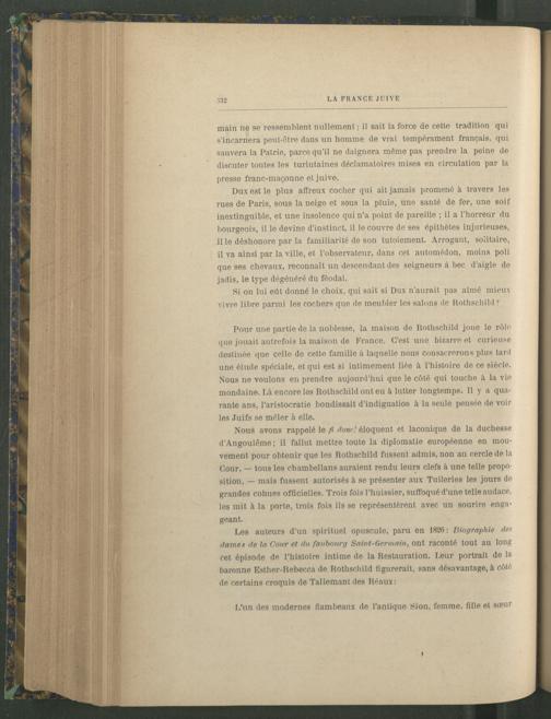 Pour une partie de la noblesse, la maison de Rothschild joue le rôle que jouait autrefois la maison de France. C’est une bizarre et curieuse destinée que celle de cette famille à laquelle nous consacrerons plus tard une étude spéciale, et qui est si intimement liée à l’histoire de ce siècle. Nous ne voulons en prendre aujourd’hui que le côté qui touche à la vio mondaine. Là encore les Rothschild ont eu à lutter longtemps. Il y a quarante ans, l’aristocratie bondissait d’indignation à la seule pensée de voir les Juifs se mêler à elle.
