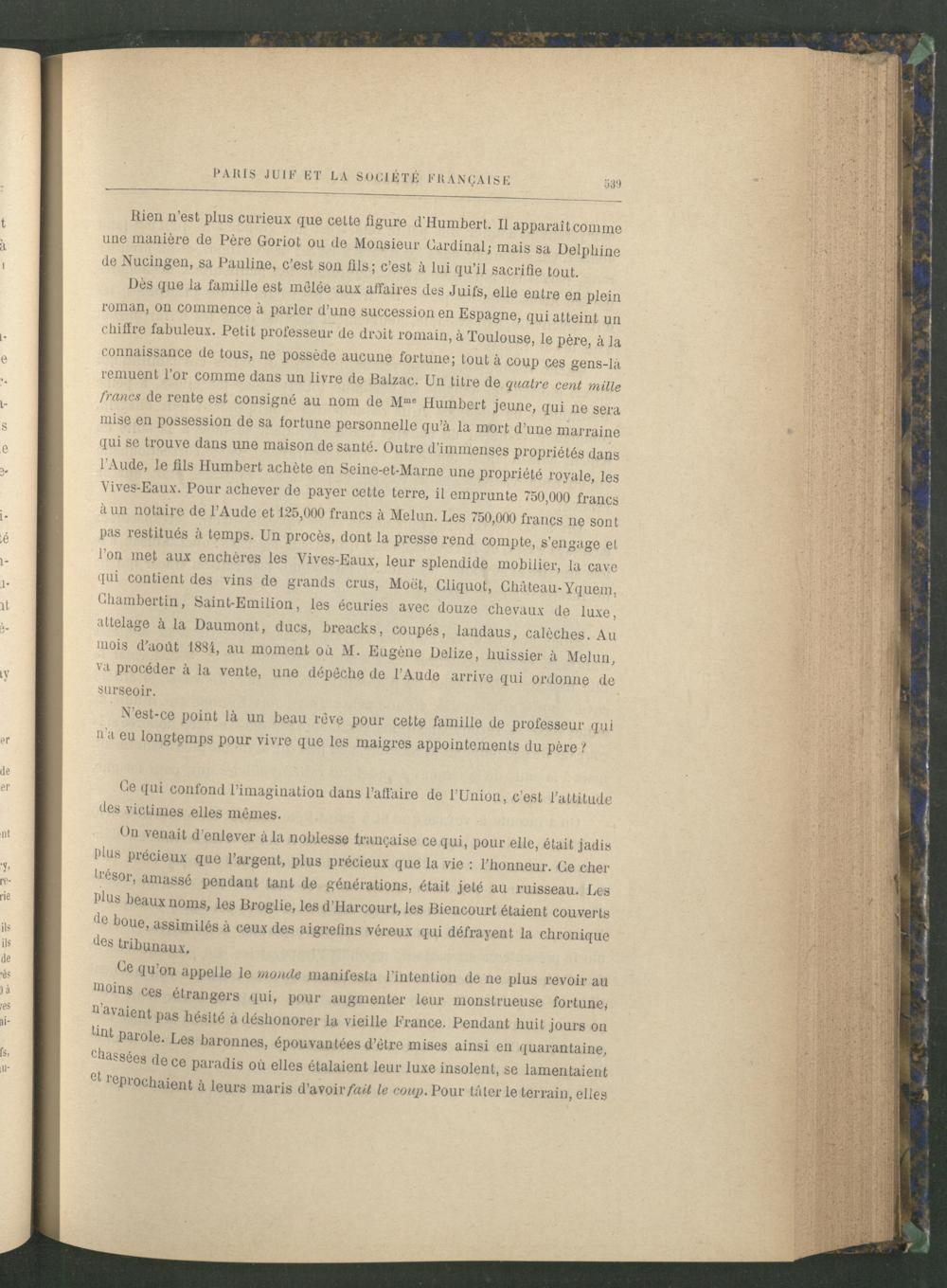 Dès que la famille est mêlée aux affaires des Juifs, elle entre en plein roman, on commence à parler d’une succession en Espagne , qui atteint un chiffre fabuleux. Petit professeur de droit romain, à Toulouse , le père, à la connaissance de tous, ne possède aucune fortune; tout à coup ces gens-là remuent l’or comme dans un livre de Balzac. Un titre de quatre cent mille francs de rente est consigné au nom de M me Humbert jeune, qui ne sera mise en possession de sa fortune personnelle qu’à la mort d’une marraine qui se trouve dans une maison de santé. Outre d’immenses propriétés dans l’Aude , le fils Humbert achète en Seine-et-Marne une propriété royale, les Vives-Eaux . Pour achever de payer cette terre, il emprunte 750,000 francs à un notaire de l’Aude et 125,000 francs à Melun . Les 750,000 francs ne sont pas restitués à temps. Un procès, dont la presse rend compte, s’engage et l’on met aux enchères les Vives-Eaux , leur splendide mobilier, la cave (lui contient des vins de grands crus, Moét , Gliquot, Château-Yquem, Ghambertin, Saint-Emilion, les écuries avec douze chevaux de luxe, attelage à la Daumont, ducs, breacks, coupés, landaus, calèches. Au mois d’aodt 18S't, au moment ou M. Eugène Delize, huissier à Melun , va procéder à la vente, une dépêche de l’Aude arrive qui ordonne de surseoir.