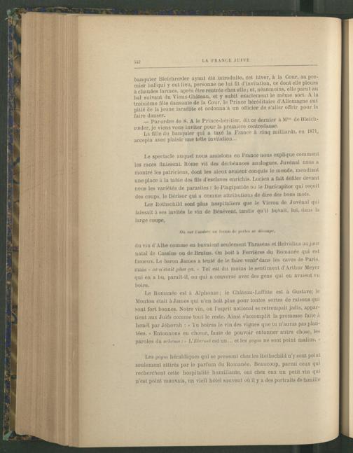 Le Romanée est à Alphonse; le Ghàteau-Laftitte est à Gustave; le Mouton était à James qui n’en boit plus pour toutes sortes de raisons qui sont fort bonnes. Notre vin, où l'esprit national se retrempait jadis, appartient aux Juifs comme tout le reste. Ainsi s’accomplit la promesse faite à Israël par Jéhovah : « Tu boiras le vin des vignes que tu n'auras pas plantées. » Entonnons en chœur, faute de pouvoir entonner autre chose, les paroles du schéma : « L'Eternel est un... et les ynym ne sont point malins. »