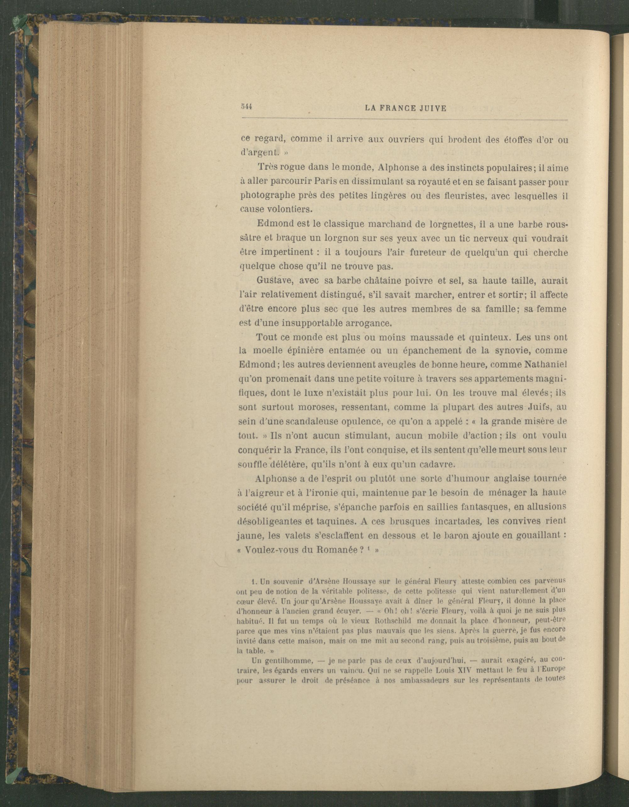 Tout ce monde est plus ou moins maussade et quinteux. Les uns ont la moelle épinière entamée ou un épanchement de la synovie, comme Edmond; les autres deviennent aveugles de bonne heure, comme Nathaniei qu’on promenait dans une petite voiture à travers ses appartements magnifiques, dont le luxe n’existait plus pour lui. On les trouve mal élevés; ils sont surtout moroses, ressentant, comme la plupart des autres Juifs, au sein d’une scandaleuse opulence, ce qu’on a appelé : « la grande misère de tout. >» Ils n’ont aucun stimulant, aucun mobile d’action; ils ont voulu conquérir la France , ils l’ont conquise, et ils sentent qu’elle meurt sous leur souffle délétère, qu’ils n’ont à eux qu’un cadavre.