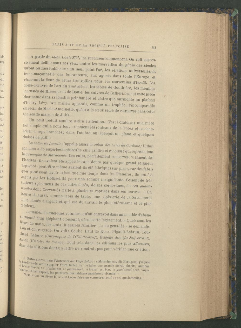 Le salon de famille s'appelle aussi le salon des cuirs de Cordoue; il doit son nom à de superbes tentures de cuir gauffré et repoussé qui représentent le Triomphe de Mardochée. Ces cuirs, parfaitement conservés, viennent des Flandres; ils avaient été apportés sans doute par quelque grand seigneur espagnol; peut- être même avaient- ils été fabriqués sur place, car des fabriques paraissent avoir existé quelque temps dans les Flandres; ils ont été acquis par les Rothschild pour une somme insignifiante. Ce sont de très curieux spécimens de ces cuirs dorés, de ces cordovanes, de ces guadameciles dont Cervantès parle à plusieurs reprises dans ses œuvres 1. On trouve là aussi, comme tapis de table, une tapisserie de la Savonnerie toute làmée d'argent et qui est du travail le plus intéressant et le plus précieux.