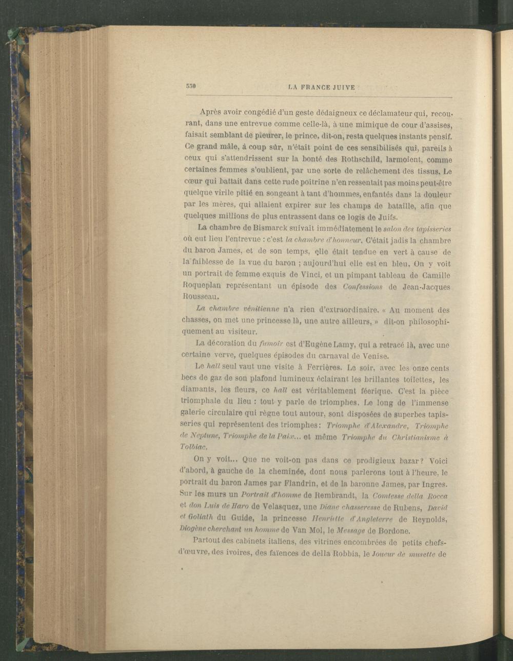 La chambre de Bismarck suivait immédiatement le salon des tapisseries où eut lieu l’entrevue : c’est la chambre d’honneur , C’était jadis la chambre du baron James, et de son temps, çlle était tendue en vert à cause de la'faiblesse de la vue du baron ; aujourd’hui elle est en bleu. On y voit un portrait de femme exquis de Vinci, et un pimpant tableau de Camille Roqueplan représentant un épisode des Confessions de Jean-Jacques Rousseau .
