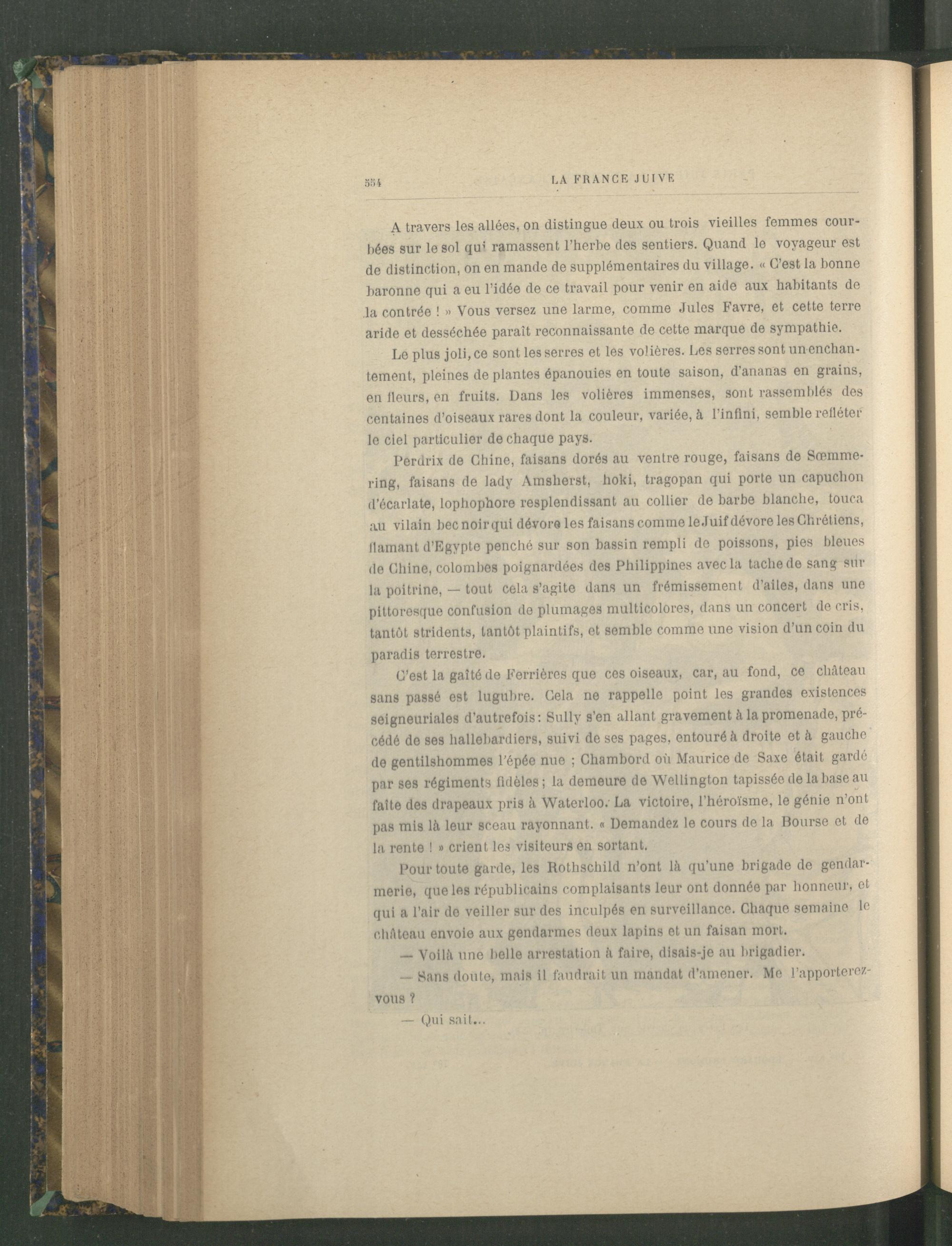 Pour toute garde, les Rothschild n’ont là qu’une brigade de gendarmerie, que les républicains complaisants leur ont donnée par honneur, et qui a l’air do veiller sur des inculpés en surveillance. Chaque semaine le chAtoau envoie aux gendarmes deux lapins et un faisan mort.