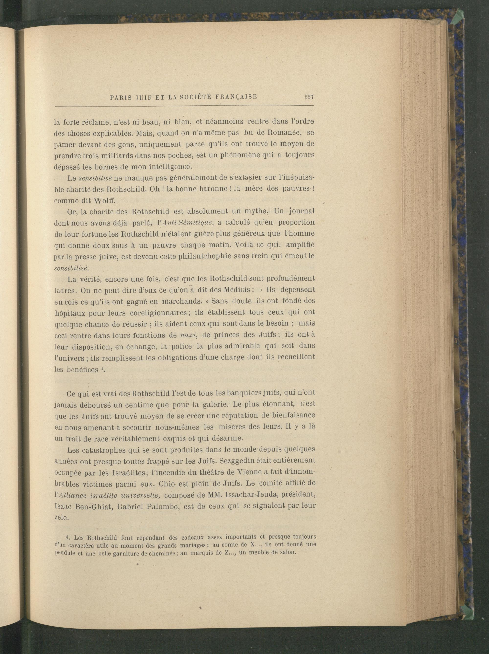 La vérité, encore une lois, c’est que les Rothschild sont profondément ladres. On ne peut dire d’eux ce qu’on a dit des Médicis : « Us dépensent en rois ce qu’ils ont gagné en marchands. » Sans doute ils ont fondé des hôpitaux pour leurs coreligionnaires; ils établissent tous ceux qui ont quelque chance de réussir ; ils aident ceux qui sont dans le besoin ; mais ceci rentre dans leurs fonctions de nazi, de princes des Juifs ; ils ont à leur disposition, en échange, la police la plus admirable qui soit dans l’univers ; ils remplissent les obligations d’une charge dont ils recueillent les bénéfices *.