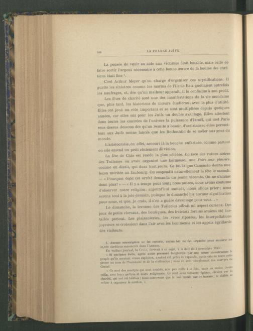 Les fêtes de charité sont une des manifestations de la vie mondaine que, plus tard, les historiens de mœurs étudieront avec le plus d’utilité. Elles ont joué un rôle important et se sont multipliées depuis quelques années, car elles ont pour les Juifs un double avantage. Elles attestent dans toutes les contrées de l’univers la puissance d’Israël , qui met Paris sens dessus dessous dès qu’un Sémite a besoin d’assistance; elles permettent aux Juifs moins lancés que les Rothschild de se mêler aux gens du monde.