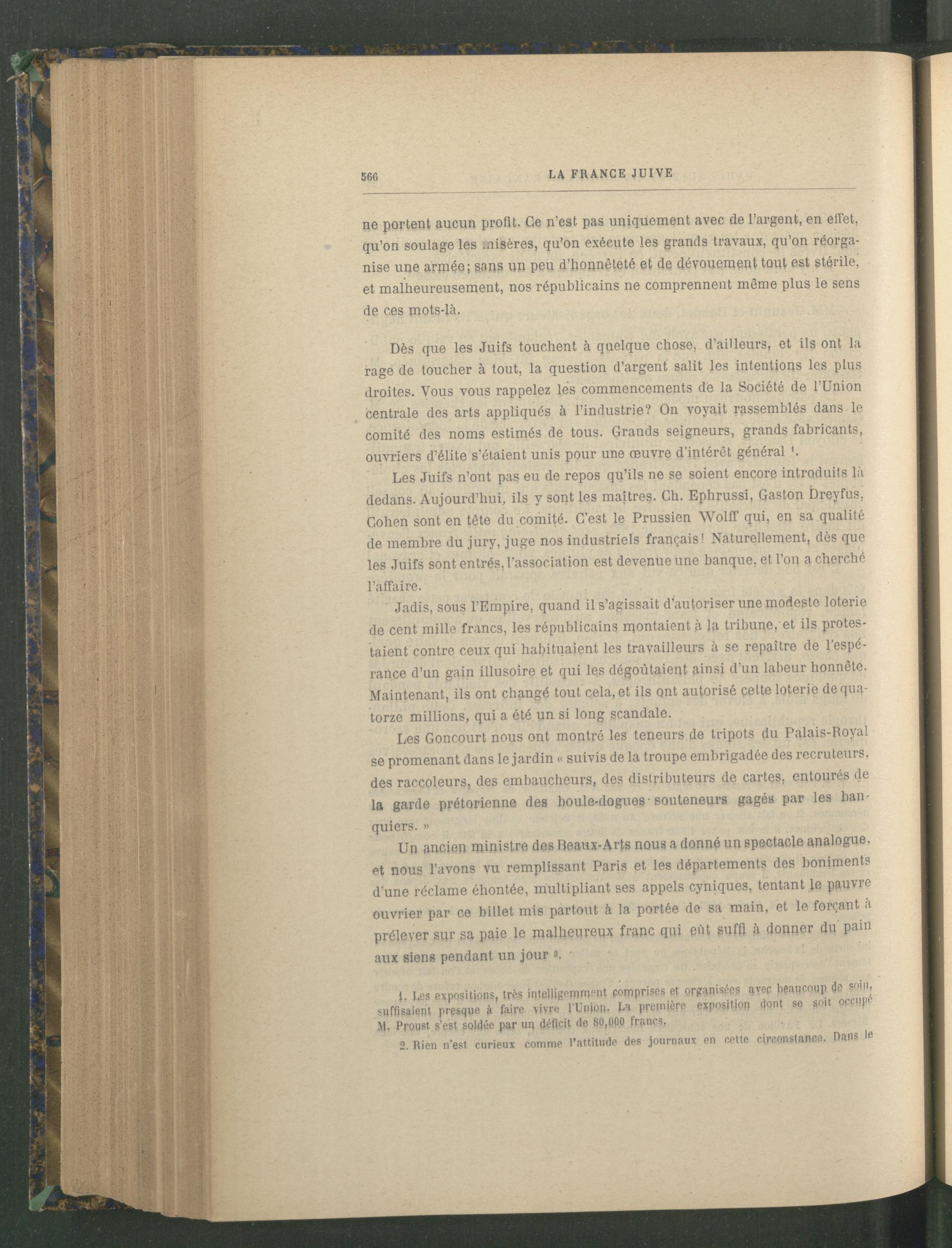 Les Juifs n’ont pas eu de repos qu’ils ne se soient encore introduits là dedans. Aujourd’hui, ils y sont les maîtres. Ch. Ephrussi, Gaston Dreyfus, Cohen sont en tête du comité. C’est le Prussien Wolff qui, en sa qualité de membre du jury, juge nos industriels français ! Naturellement, dès que les Juifs sont entrés, l'association est devenue une banque, et l’on a cherché l’affaire.