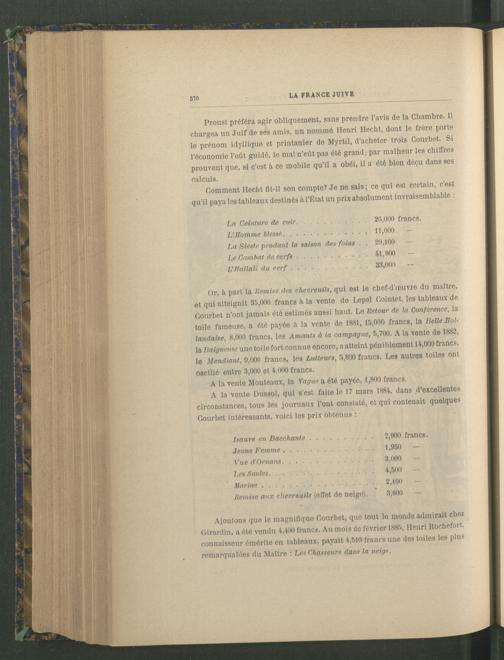 Proust préféra agir obliquement, sans prendre l’avis de la Chambre. Il chargea un Juif de ses amis, un nommé Henri Hecht, dont le frère porte le prénom idyllique et printanier de Myrtil, d’acheter trois Courbet. Si l’économie l’eût guidé, le mal n’eût pas été grand; par malheur les chiffres prouvent que, si c’est à ce mobile qu’il a obéi, il a été bien déçu dans ses calculs.