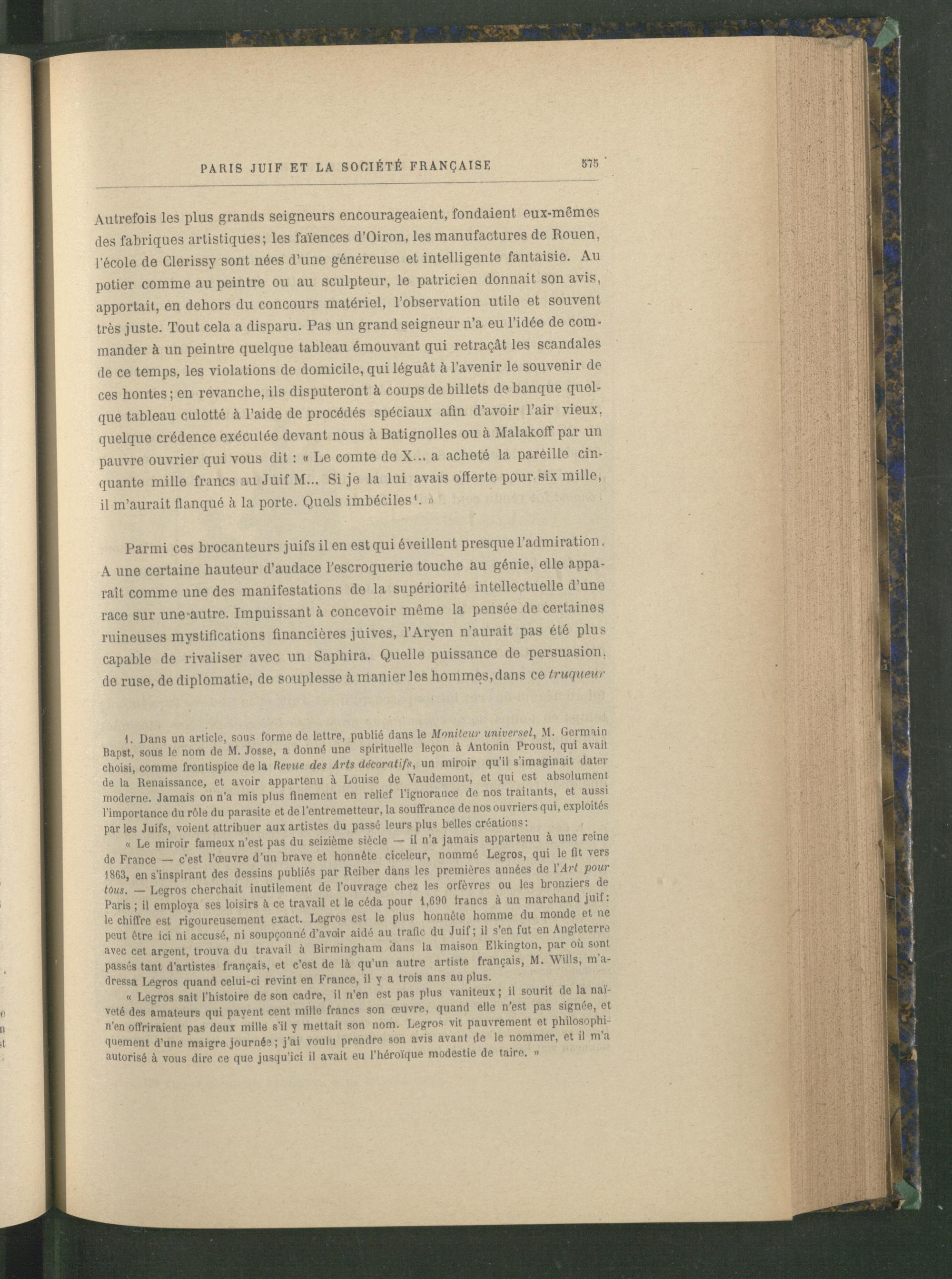 f. Dans un article, sous forme de lettre, publié dans le Moniteur universel , M. Germain Bapst , sous le nom de M. Josse, a donné une spirituelle leçon à Antonin Proust , qui avait choisi, comme frontispice de la Revue des Arts décoratifs, un miroir qu’il s’imaginait dater de la Renaissance, et avoir appartenu à Louise de Vaudemont , et qui est absolument moderne. Jamais on n’a mis plus finement en relief l'ignorance de nos traitants, et aussi l'importance du rôle du parasite et de l’entremetteur, la souffrance de nos ouvriers qui, exploités par les Juifs, voient attribuer aux artistes du passé leurs plus belles créations: