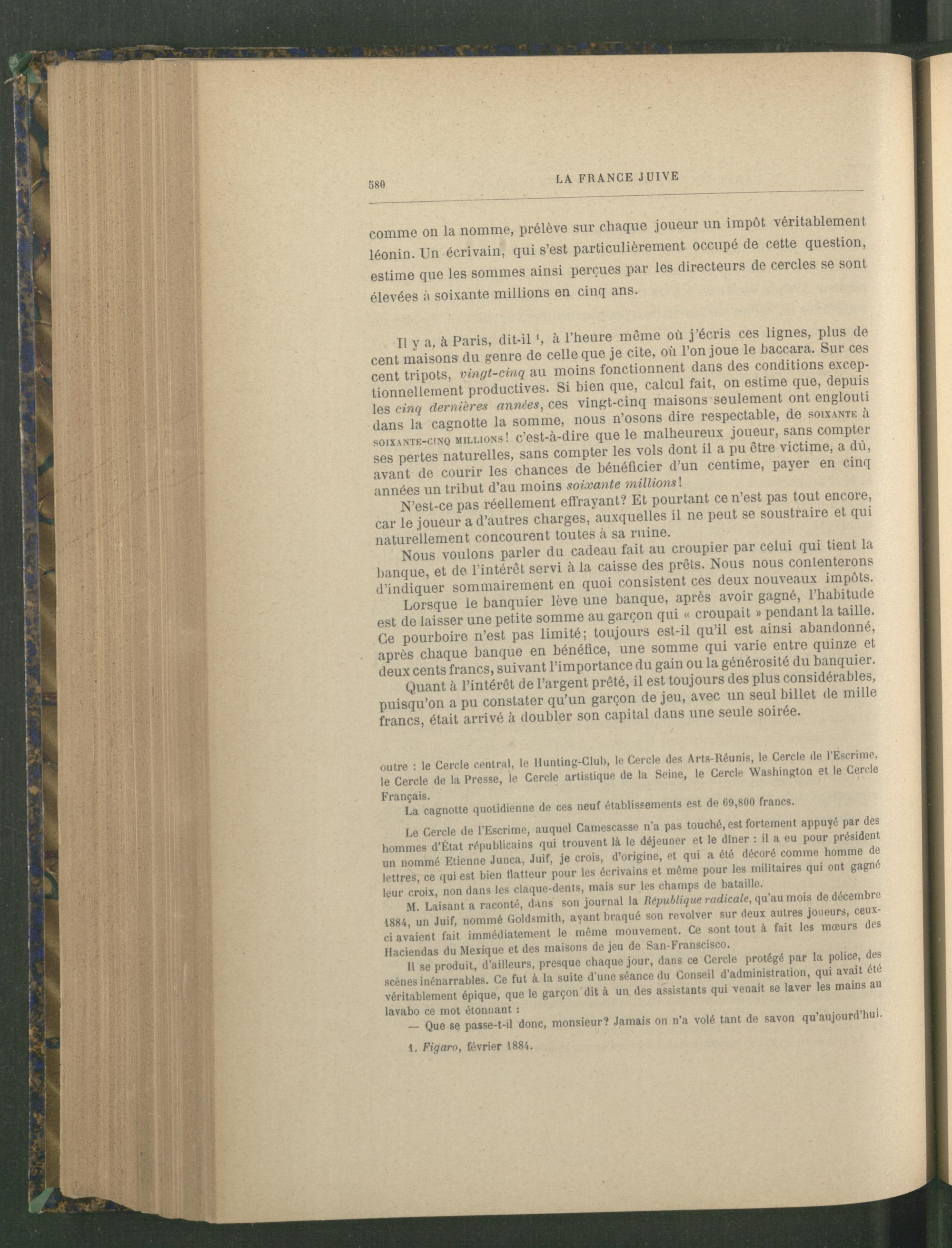 M. Laisant a raconté, dans son journal la République radicale, qu’au mois de décembre 1884, un Juif, nommé Goldsmith, ayant braqué son revolver sur deux autres joueurs, ceux- ci avaient fait immédiatement le même mouvement. Ce sont tout à fait les mœurs des Haciendas du Mexique et des maisons de jeu de San-Franscisco.
