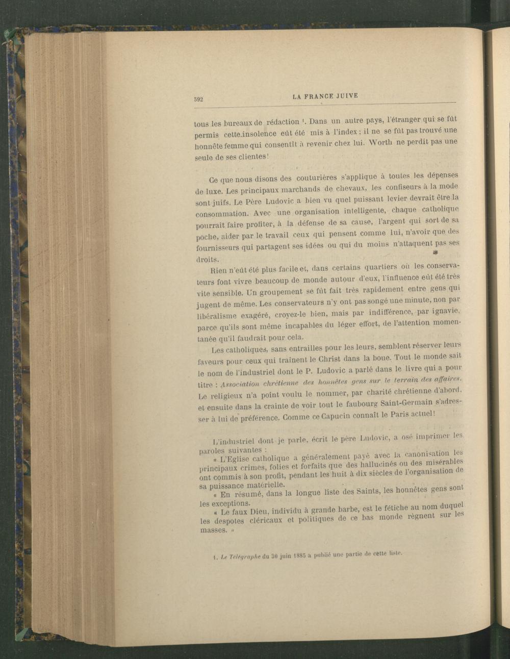 Les catholiques, sans entrailles pour les leurs, semblent réserver leurs faveurs pour ceux qui traînent le Christ dans la boue. Tout le monde sait le nom de l’industriel dont le P. Ludovic a parlé dans le livre qui a pour titre : Association chrétienne des honnêtes gens sur le terrain des affaires. Le religieux n’a point voulu le nommer, par charité chrétienne d’abord, et ensuite dans la crainte de voir tout le faubourg Saint-Germain s’adresser à lui de préférence. Comme ce Capucin connaît le Paris actuel!