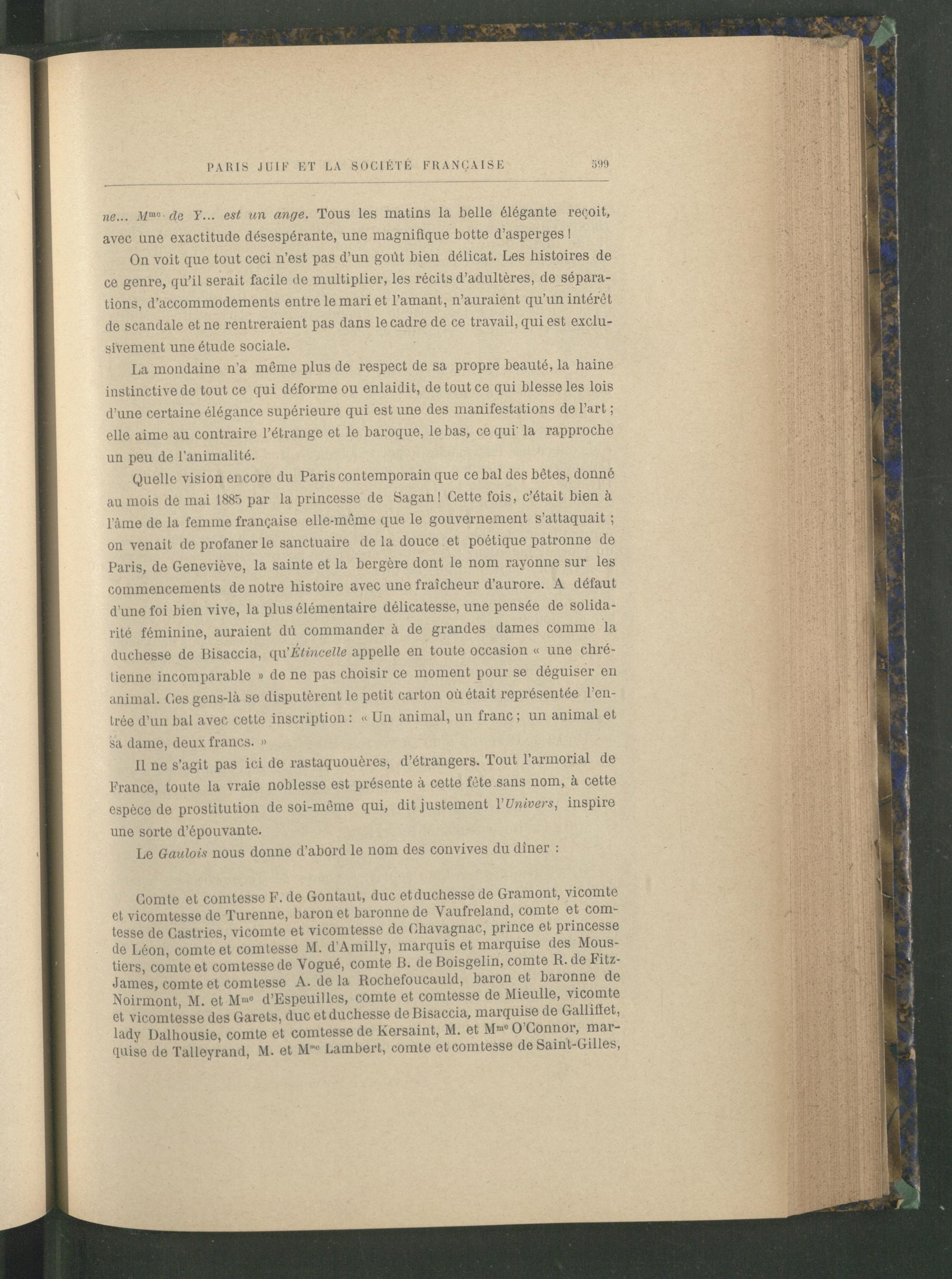 Quelle vision encore du Paris contemporain que ce bal des bêtes, donné au mois de mai 1885 par la princesse de Sagan! Cette fois, c’était bien à l’àme de la femme française elle-même que le gouvernement s’attaquait ; on venait de profaner le sanctuaire de la douce et poétique patronne de Paris , de Geneviève, la sainte et la bergère dont le nom rayonne sur les commencements de notre histoire avec une fraîcheur d’aurore. A défaut d’une foi bien vive, la plus élémentaire délicatesse, une pensée de solidarité féminine, auraient dû commander à de grandes dames comme la duchesse de Bisaccia, qu’Etincelle appelle en toute occasion « une chrétienne incomparable » de ne pas choisir ce moment pour se déguiser en animal. Ces gens-là se disputèrent le petit carton où était représentée l’entrée d’un bal avec cette inscription : « Un animal, un franc ; un animal et sa dame, deux francs. »
