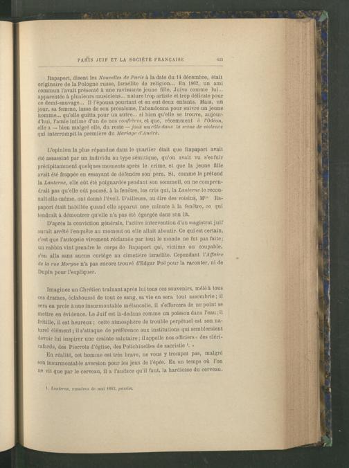 D’après la conviction générale, l’active intervention d’un magistrat juif aurait arrêté l’enquête au moment où elle allait aboutir. Ce qui est certain, c’est que l’autopsie vivement réclamée par tout le monde ne fut pas faite ; un rabbin vint prendre le corps de Rapaport qui, victime ou coupable, s’en alla sans aucun cortège au cimetière israélite. Cependant Y Affaire de la rue Morgue n’a pas encore trouvé d’Edgar Poë pour la raconter, ni de Dupin pour l’expliquer.