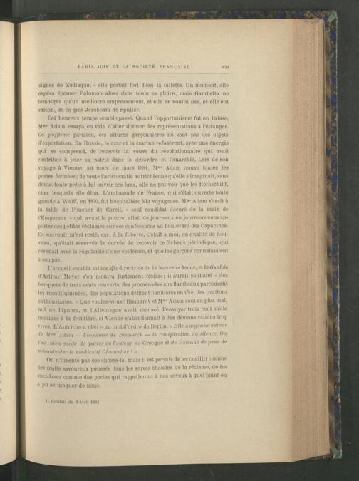 Cet heureux temps semble passé. Quand l’opportunisme fut en baisse, M œo Adam essaya en vain d’aller donner des représentations à l’étranger. Ce puffismc parisien, ces allures garçonnières ne sont pas des objets d’exportation. En Russie , le czar et la czarine refusèrent, avec une énergie qui se comprend, de recevoir la veuve du révolutionnaire qui avait contribué à jeter sa patrie dans le désordre et l'anarchie. Lors de son voyage à Vienne , au mois de mars 1884, M mc Adam trouva toutes les portes fermées ; de toute l’aristocratie autrichienne qu’elle s’imaginait, sans doute, toute prête à lui ouvrir ses bras, elle ne put voir que les Rothschild , chez lesquels elle dîna. L’ambassade de France , qui s’était ouverte toute grande à Wolff, en 1870, fut hospitalière à la voyageuse. M mo Adam s’assit à la talile de Fouclier de Gareil, « seul candidat décoré de la main de l’Empereur » qui, avant la guerre, allait de journaux en journaux nous apporter des petites réclames sur ses conférences au boulevard des Capucines. Ce souvenir m’est resté, car, à la Liberté, c’était à moi, en qualité de nouveau, qu’était réservée la corvée de recevoir ce fâcheux périodique, qui revenait avec la régularité d’une épidémie, et que les garçons connaissaient à son pas.