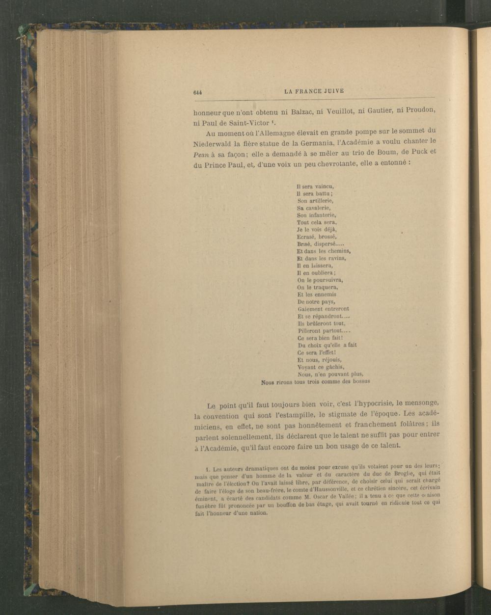 Au moment où l’Allemagne élevait en grande pompe sur le sommet du Niederwald la fière statue de la Germania, l’Académie a voulu chanter le Pean à sa façon; elle a demandé à se mêler au trio de Boum, de Puck et du Prince Paul , et, d’une voix un peu chevrotante, elle a entonné :