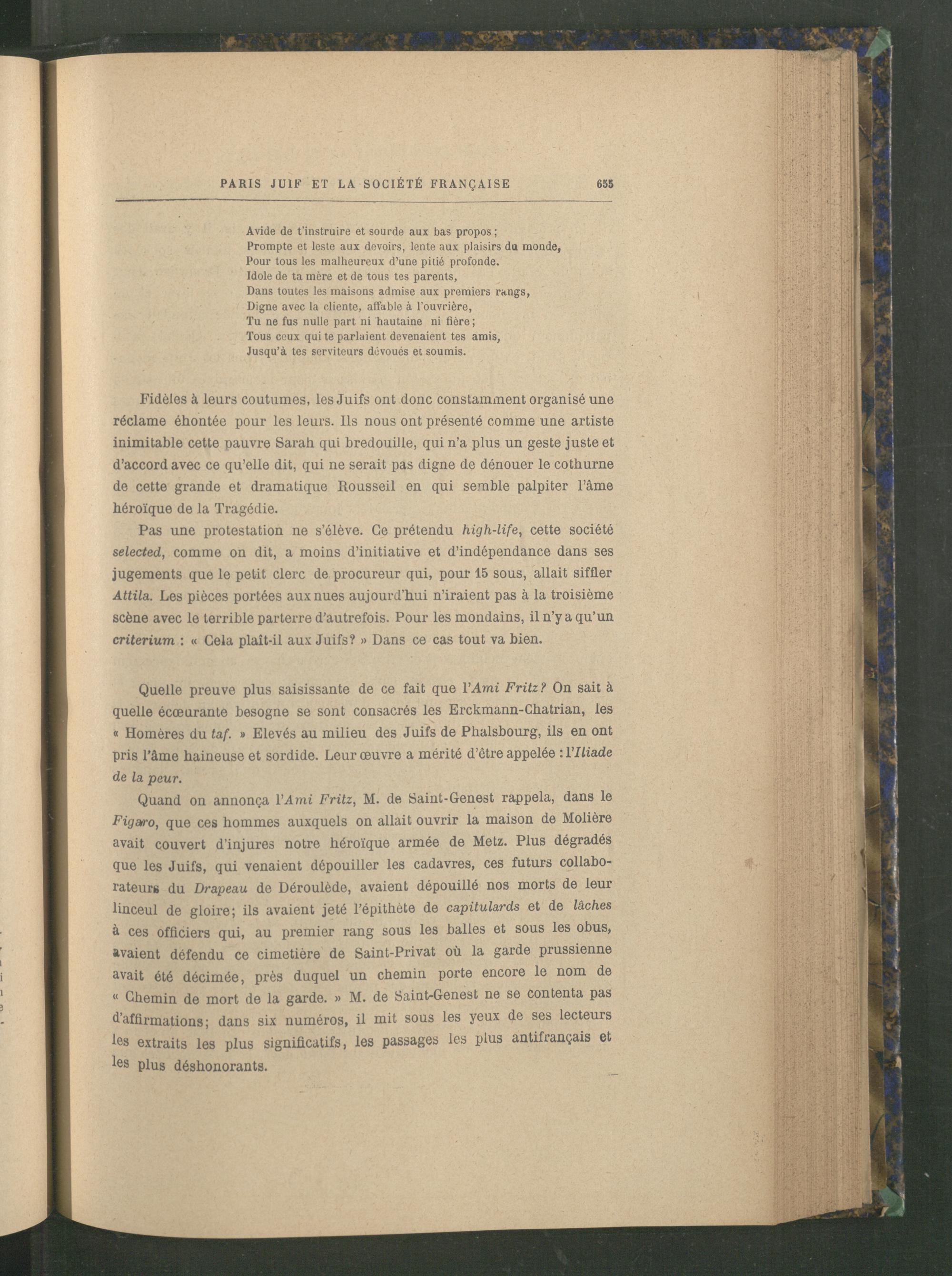 Quelle preuve plus saisissante de ce fait que l’Ami Fritz? On sait à quelle écœurante besogne se sont consacrés les Erckmann-Chatrian , les « Homères du taf. » Elevés au milieu des Juifs de Phalsbourg , ils en ont pris l’âme haineuse et sordide. Leur œuvre a mérité d’être appelée : ïIliade de la peur.