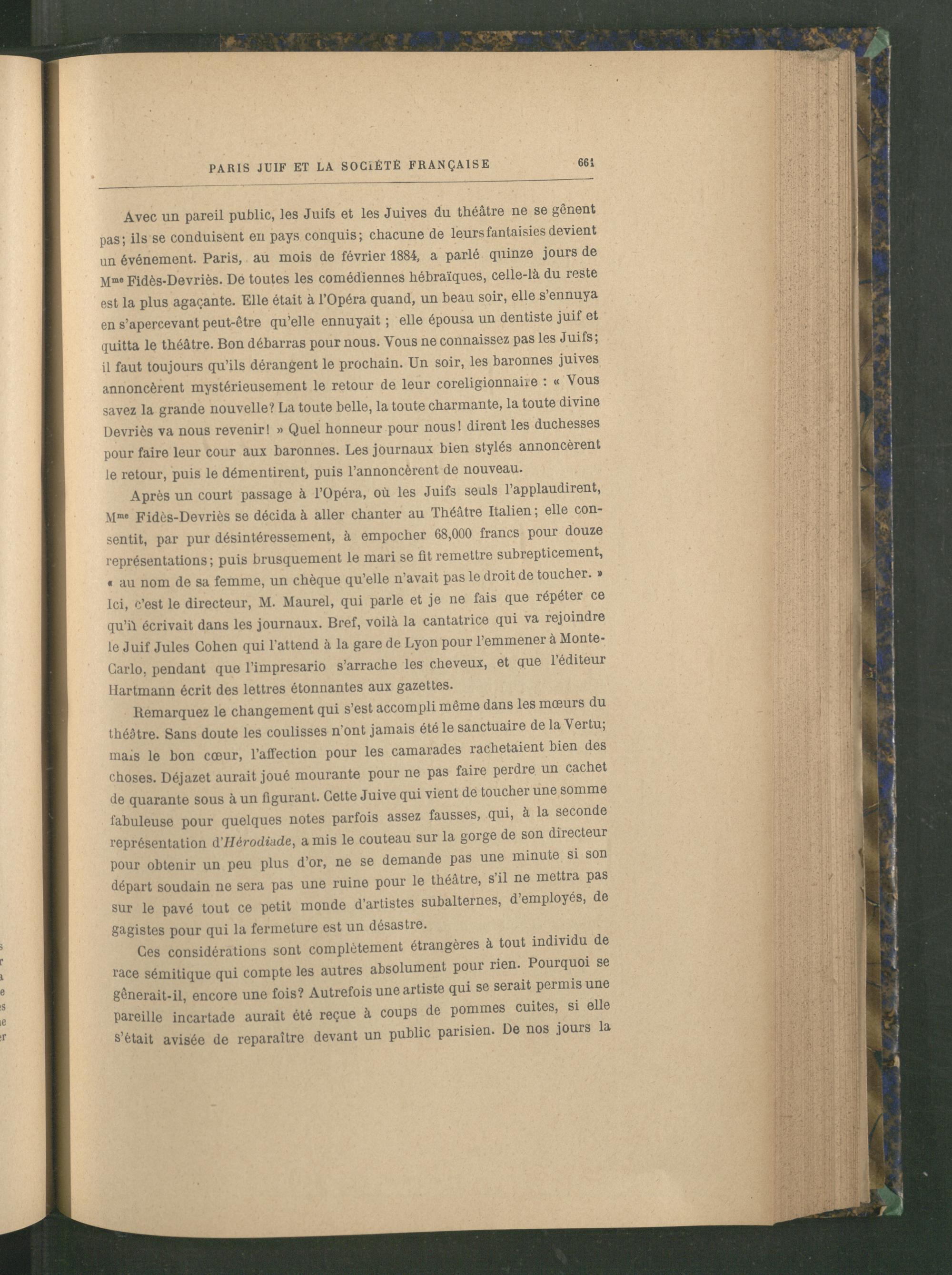 Après un court passage à l’Opéra, où les Juifs seuls l’applaudirent, M me Fidès-Devriès se décida à aller chanter au Théâtre Italien ; elle consentit, par pur désintéressement, à empocher 68,000 francs pour douze représentations ; puis brusquement le mari se fit remettre subrepticement, « au nom de sa femme, un chèque qu’elle n’avait pas le droit de toucher. » ici, c’est le directeur, M. Maurel, qui parle et je ne fais que répéter ce qu’iï écrivait dans les journaux. Bref, voilà la cantatrice qui va rejoindre le Juif Jules Cohen qui l’attend à la gare de Lyon pour l’emmener à Monte- Carlo, pendant que l’imprésario s’arrache les cheveux, et que l’éditeur Hartmann écrit des lettres étonnantes aux gazettes.