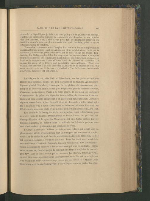 Les hôtels du faubourg Saint-Germain gardent leurs volets fermés pendant dix mois de l’année. Presque tous les beaux hôtels du quartier des Champs-Elysées et du quartier Monceaux sont aux Juifs; parfois, par les fenêtres ouvertes, on entend dans la solitude les échos de quelque concert, c’est un Juif quelconque qui soigne sa névrose.