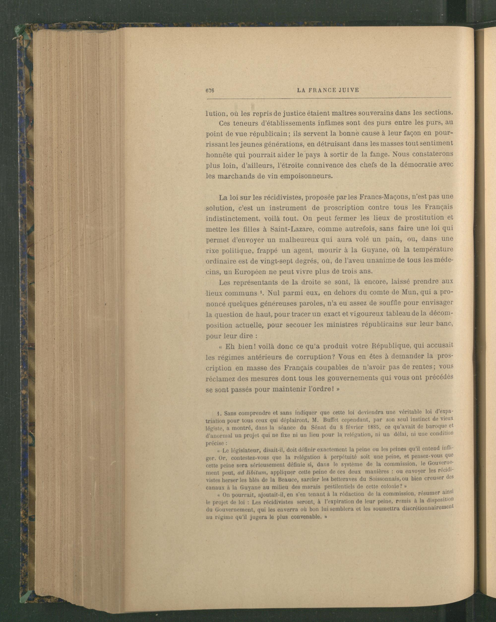 La loi sur les récidivistes, proposée parles Francs-Maçons , n’est pas une solution, c’est un instrument de proscription contre tous les Français indistinctement, voilà tout. On peut fermer les lieux de prostitution et mettre les filles à Saint-Lazare, comme autrefois, sans faire une loi qui permet d’envoyer un malheureux qui aura volé un pain, ou, dans une rixe politique, frappé un agent, mourir à la Guyane , où la température ordinaire est de vingt-sept degrés, où, de l'aveu unanime de tous les médecins, un Européen ne peut vivre plus de trois ans.