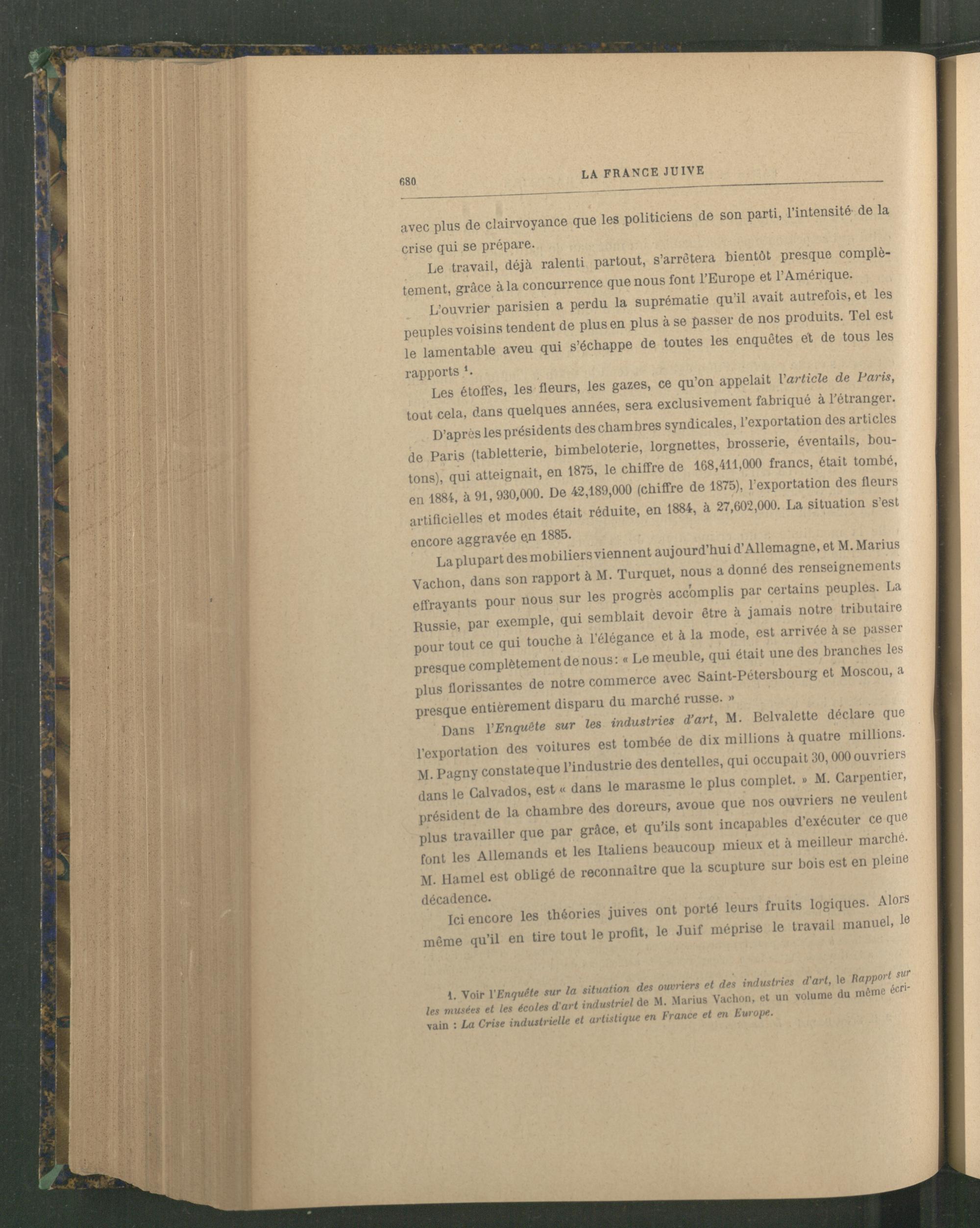 Dans l'Enquête sur les industries d’art, M. Bel Valette déclare que l’exportation des voitures est tombée de dix millions à quatre millions. M. Pagny constateque l’industrie des dentelles, qui occupait 30,000 ouvriers dans le Calvados , est « dans le marasme le plus complet. » M. Carpentier, président de la chambre des doreurs, avoue que nos ouvriers ne veulent plus travailler que par grâce, et qu'ils sont incapables d’exécuter ce que font les Allemands et les Italiens beaucoup mieux et à meilleur marché. M. Hamel est obligé de reconnaître que la scupture sur bois est en pleine décadence.