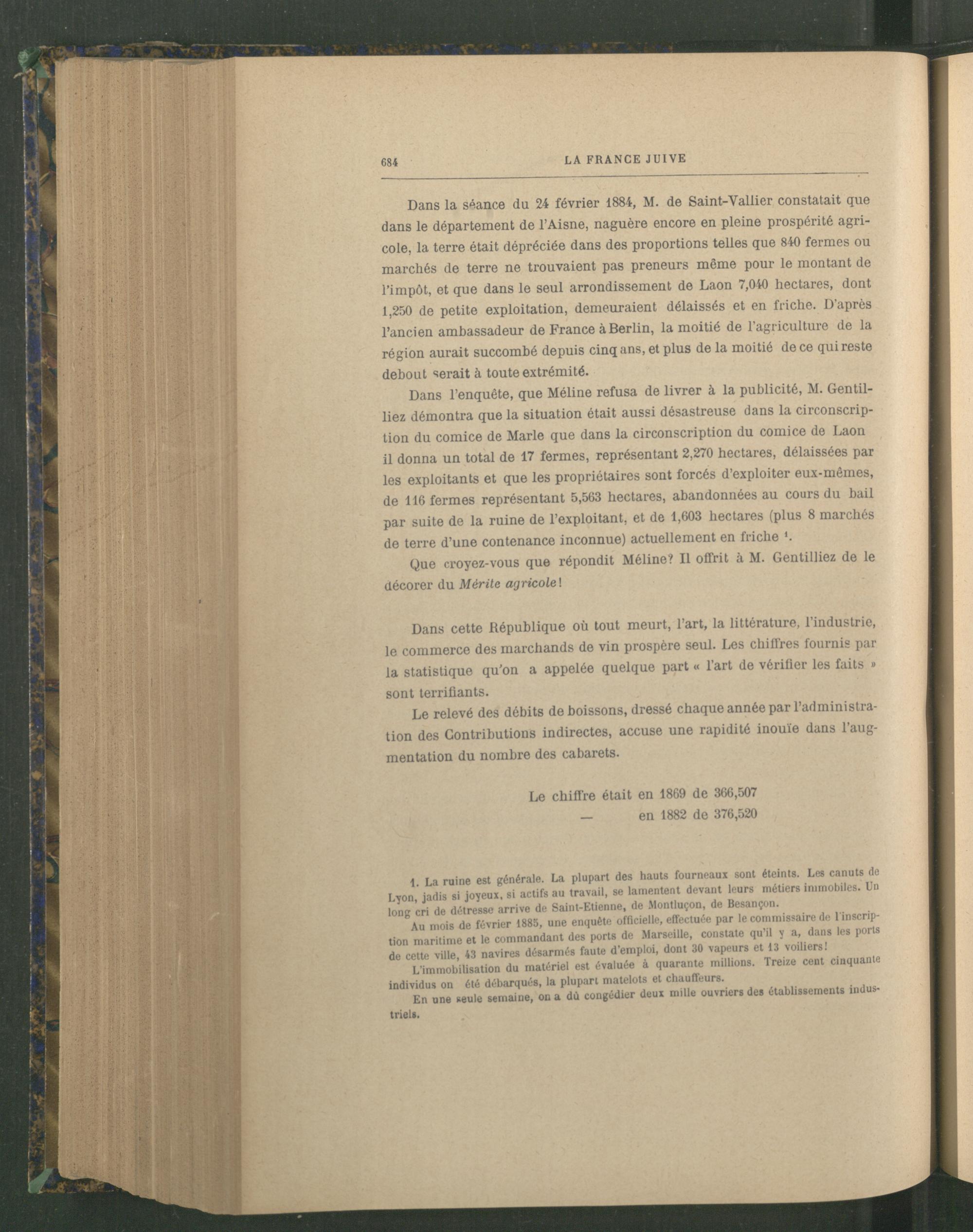 Dans la séance du 24 février 1884, M. de Saint-Vallier constatait que dans le département de l’Aisne , naguère encore en pleine prospérité agricole, la terre était dépréciée dans des proportions telles que 840 fermes ou marchés de terre ne trouvaient pas preneurs même pour le montant de l’impôt, et que dans le seul arrondissement de Laon 7,040 hectares, dont 1,250 de petite exploitation, demeuraient délaissés et en friche. D’après l’ancien ambassadeur de France à Berlin , la moitié de l’agriculture de la région aurait succombé depuis cinq ans, et plus de la moitié de ce qui reste debout serait à toute extrémité.
