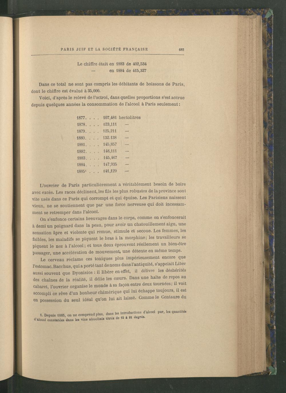 L’ouvrier de Paris particulièrement a véritablement besoin de boire avec excès. Les races déclinent, les fils les plus robustes de la province sont vite usés dans ce Paris qui corrompt et qui épuise. Les Parisiens naissent vieux, ne se soutiennent que par une force nerveuse qui doit incessamment se retremper dans l’alcool.