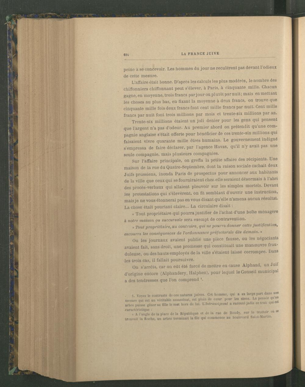 On s’arrêta, car on eût été forcé de mettre en cause Alphand, un Juif d’origine encore (Alphandery, Halphen), pour lequel le Conseil municipal a des tendresses que l’on comprend ’.