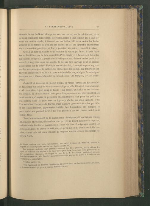 Tout le mouvement de la Maçonnerie : intrigues, dénonciations contre d’honnêtes chrétiens, démarches pour priver un brave homme de sa place, enlèvements d’enfants, poursuites à l’aide de faux témoignages contre les ecclésiastiques, ce qu’on ne sait pas, ce qu’on ne se dit qu’entre affidés très sûrs, — tout cela est venu pendant de longues années aboutir au chemin de fer du Nord .