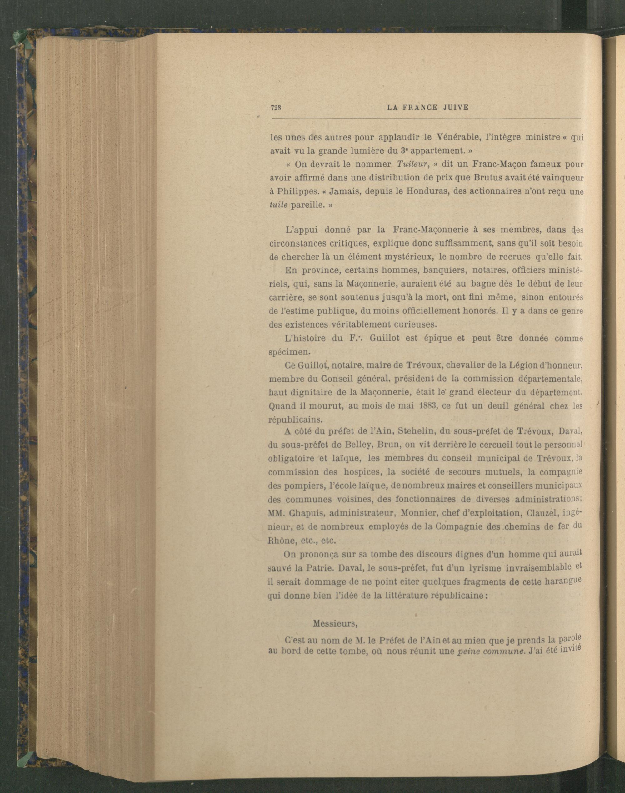 Ce Guillot, notaire, maire de Trévoux, chevalier de la Légion d'honneur, membre du Conseil général, président de la commission départementale, haut dignitaire de la Maçonnerie , était le" grand électeur du département. Quand il mourut, au mois de mai 1883, ce fut un deuil général chez les républicains.