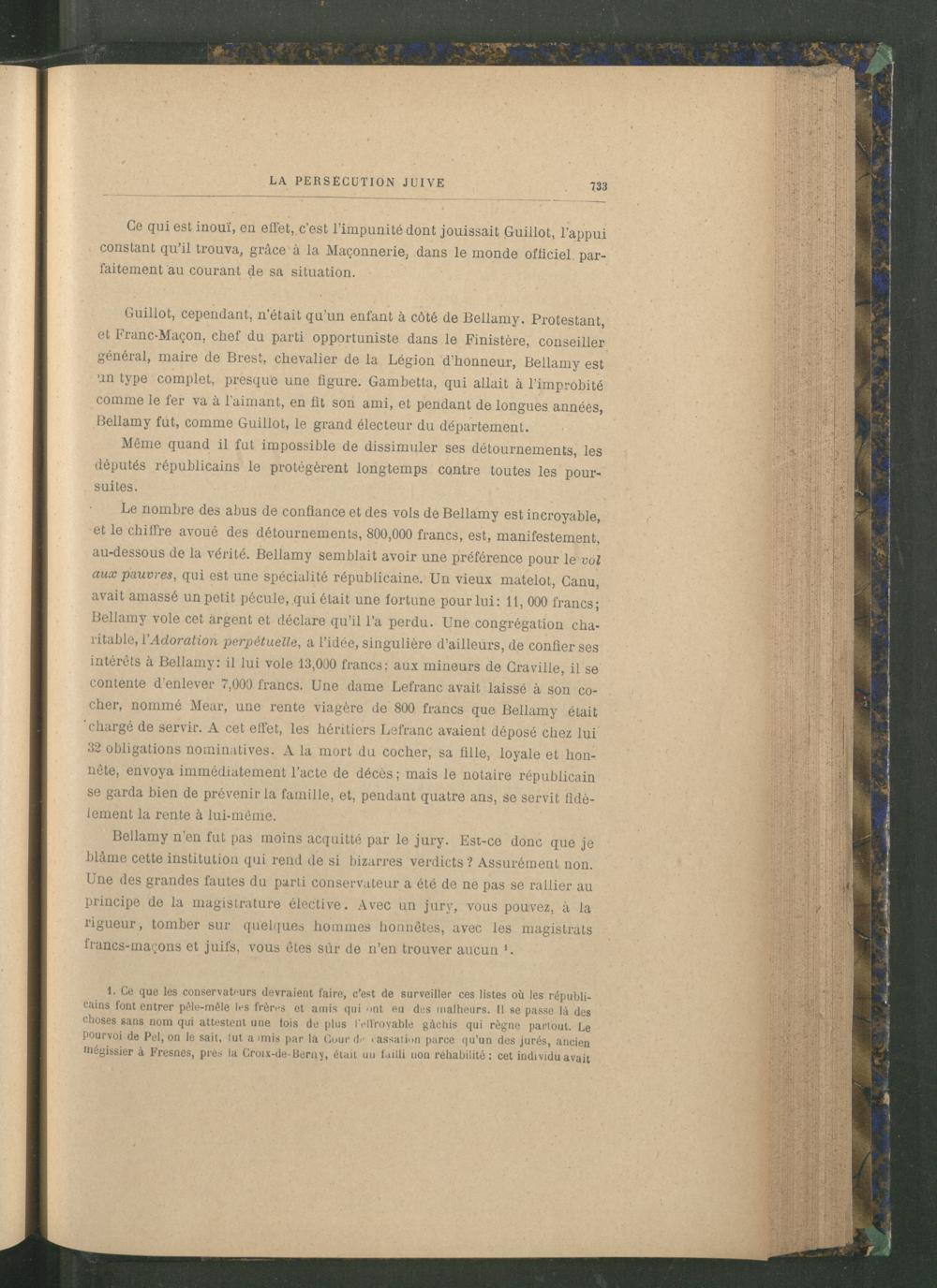 Bellamy n’en fut pas moins acquitté par le jury. Est-ce donc que je blâme cette institution qui rend de si bizarres verdicts ? Assurément non. Une des grandes fautes du parti conservateur a été de ne pas se rallier au principe de la magistrature élective. Avec un jury, vous pouvez, à la rigueur, tomber sur quelques hommes honnêtes, avec les magistrats francs-maçons et juifs, vous êtes sur de n’en trouver aucun *.