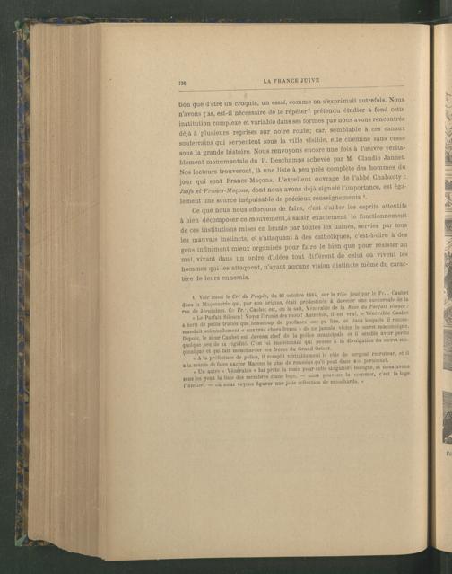 tion que d’être un croquis, un essai, comme on s’exprimait autrefois. Nous n’avons pas, est-il nécessaire de le répéter? prétendu étudier à fond cette institution complexe et variable dans ses formes que nous avons rencontrée déjà à plusieurs reprises sur notre route; car, semblable à ces canaux souterrains qui serpentent sous la ville visible, elle chemine sans cesse sous la grande histoire. Nous renvoyons encore une fois à l’œuvre véritablement monumentale du P. Deschamps achevée par M. Claudio Jannet . Nos lecteurs trouveront, là une liste à peu près complète des hommes du jour qui sont Francs-Maçons . L’excellent ouvrage de l’abbé Chabauty : Juifs et Francs-Maçons , dont nous avons déjà signalé l’importance, est également une source inépuisable de précieux renseignements '.