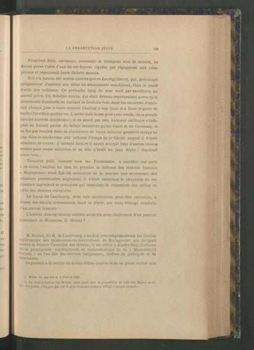 M. Monod, dit M. de Gambourg, a traduit avec empressement les libelles antifrançais des missionnaires méthodistes de Madagascar , qui dirigent contre la France l'hostilité des llowas ; il est affilié à Èxeter-Hall, l’oiüeine de la propagande antifrançaise et anticatholique de la « Missionnary Society » où l’on fait des œuvres religieuses, mêlées de politique et de commerce.