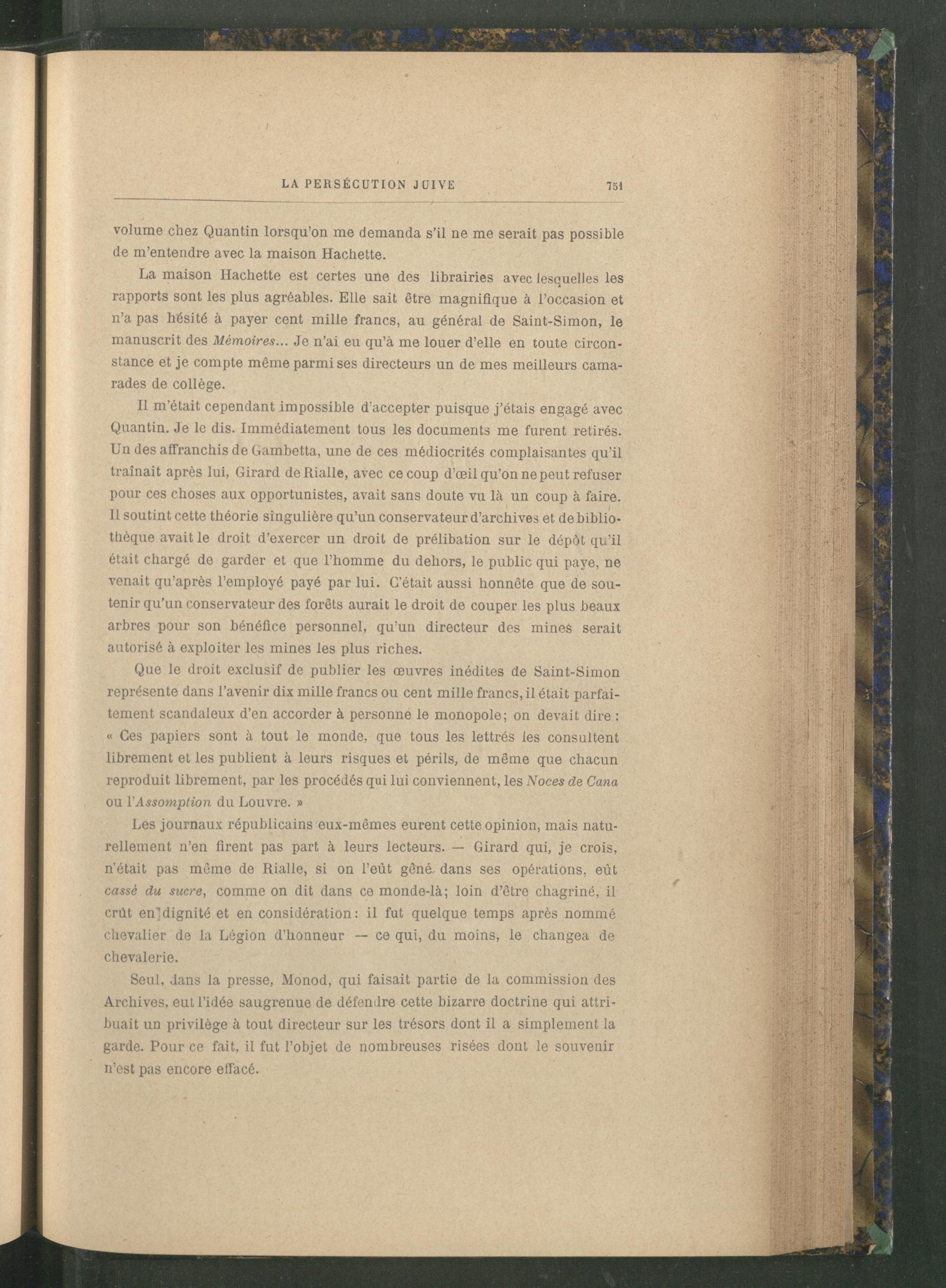 La maison Hachette est certes une des librairies avec lesquelles les rapports sont les plus agréables. Elle sait être magnifique à l’occasion et n’a pas hésité à payer cent mille francs, au général de Saint-Simon, le manuscrit des Mémoires... Je n’ai eu qu’à me louer d’elle en toute circonstance et je compte même parmi ses directeurs un de mes meilleurs camarades de collège.