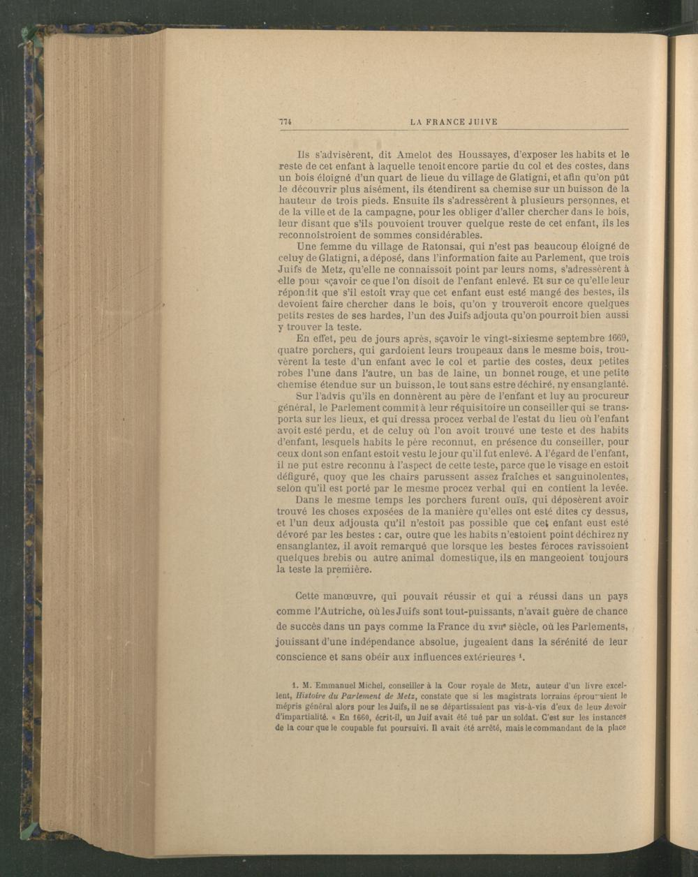 1. M. Emmanuel Michel, conseiller à la Cour royale de Metz , auteur d'un livre excellent, Histoire du Parlement de Metz, constate que si les magistrats lorrains éprouvaient le mépris général alors pour les Juifs, il ne se départissaient pas vis-à-vis d’eux de leur devoir d’impartialité. « En 1660, écrit-il, un Juif avait été tué par un soldat. C’est sur les instances de la cour que le coupable fut poursuivi. Il avait été arrêté, mais le commandant de la place