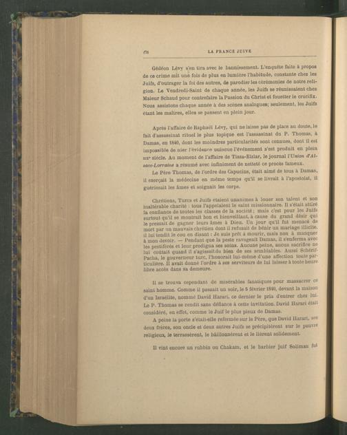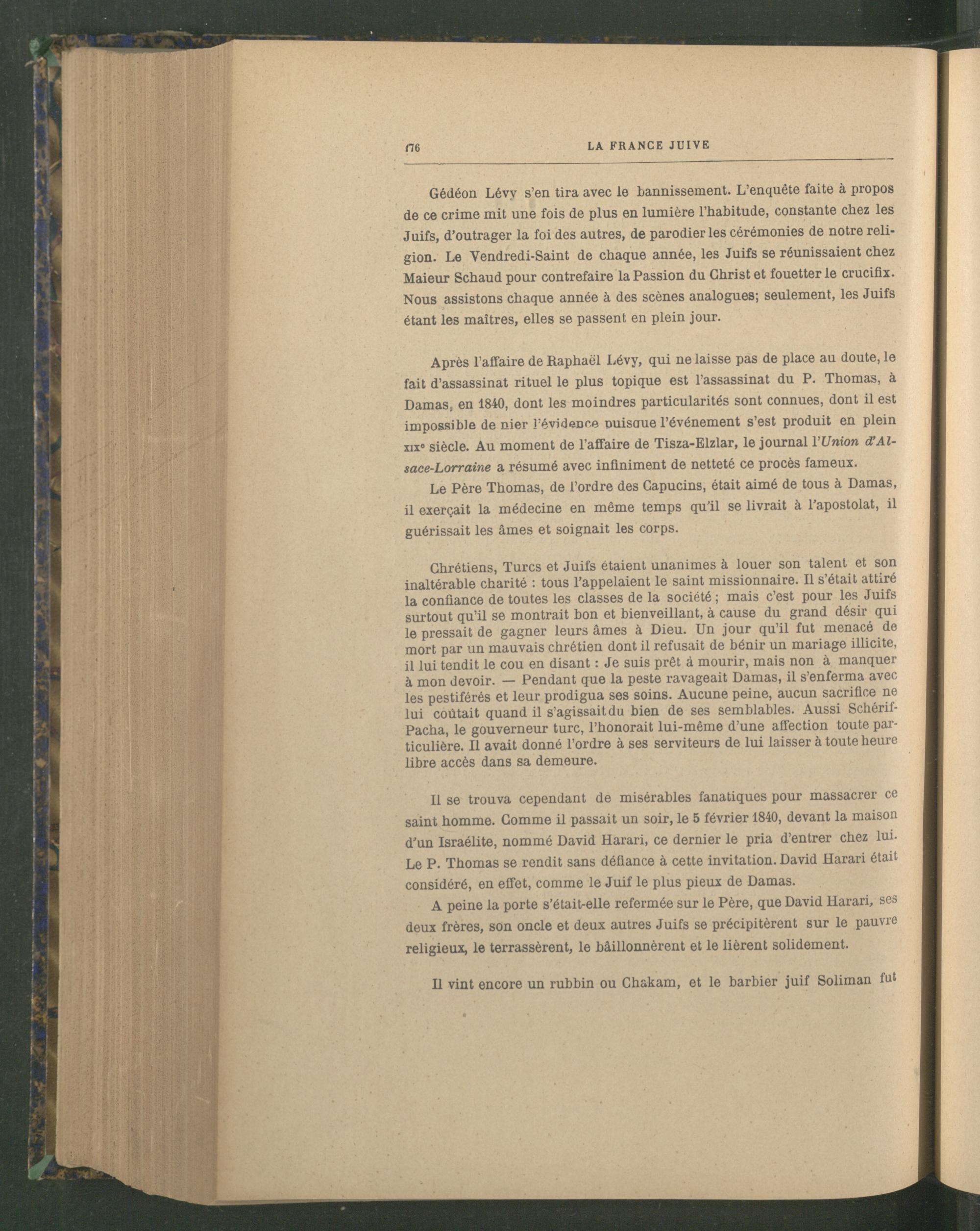 Après l’affaire de Raphaël Lévy, qui ne laisse pas de place au doute, le fait d’assassinat rituel le plus topique est l’assassinat du P. Thomas, à Damas, en 1840, dont les moindres particularités sont connues, dont il est impossible de nier l’évidence nuisaue l’événement s’est produit en plein xix» siècle. Au moment de l’affaire de Tisza-Elzlar, le journal l’Union cCAlsace-Lorraine a résumé avec infiniment de netteté ce procès fameux.