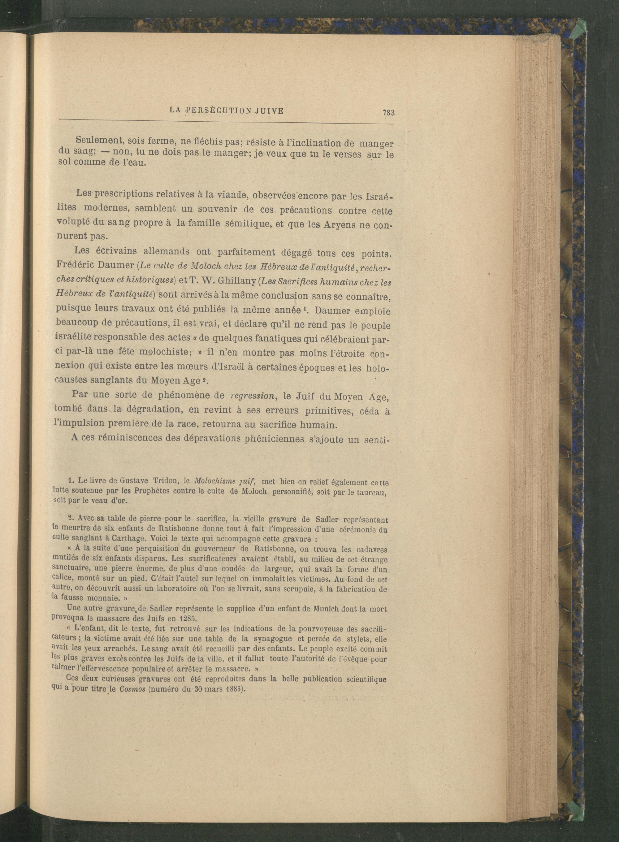 Par une sorte de phénomène de régression, le Juif du Moyen Age , tombé dans la dégradation, en revint à ses erreurs primitives, céda à l’impulsion première de la race, retourna au sacrifice humain.