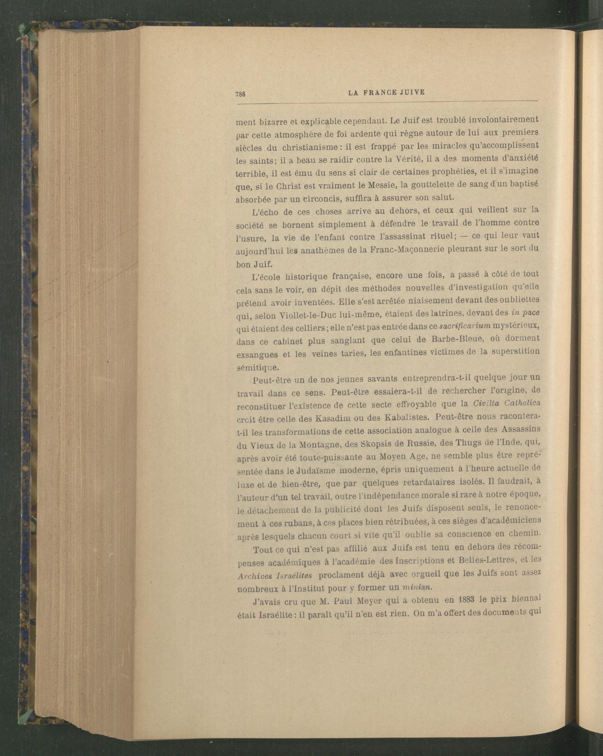 L’école historique française, encore une fois, a passé à côté de tout cela sans le voir, en dépit des méthodes nouvelles d’investigation qu’elle prétend avoir inventées. Elle s’est arrêtée niaisement devant des oubliettes qui, selon Viollet-le-Duc lui-même, étaient des latrines, devant des in pa.ce qui étaient des celliers ; elle n’est pas entrée dans ce sacrificarium mystérieux, dans ce cabinet plus sanglant que celui de Barbe-Bleue, où dorment exsangues et les veines taries, les enfantines victimes de la superstition sémitique.