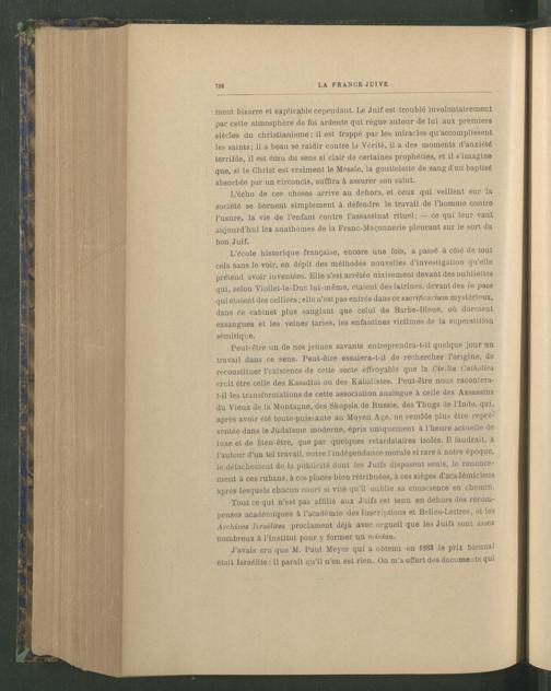 Tout ce qui n’est pas affilié aux Juifs est tenu en dehors des récompenses académiques à l’académie des Inscriptions et Belles-Lettres , et les Archioes Israélites proclament déjà avec orgueil que les Juifs sont assez nombreux à l’Institut pour y former un minian.