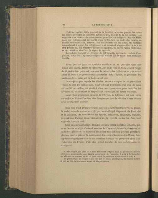 C’est un Juif autrichien, Hendlé, devenu préfet de Saône-et-Loire , qui, nous l’avons vu déjà, s’entend avec un Juif nommé Schnerb, directeur de la Sûreté générale, et autrefois rédacteur en chef d’un journal pornographique, pour organiser la destruction des croix à Montceau-les-Mines , faire condamner quelques-uns de nos ouvriers français et permettre ainsi l’introduction en France d’un plus grand nombre de ses coreligionnaires étrangers 1 .