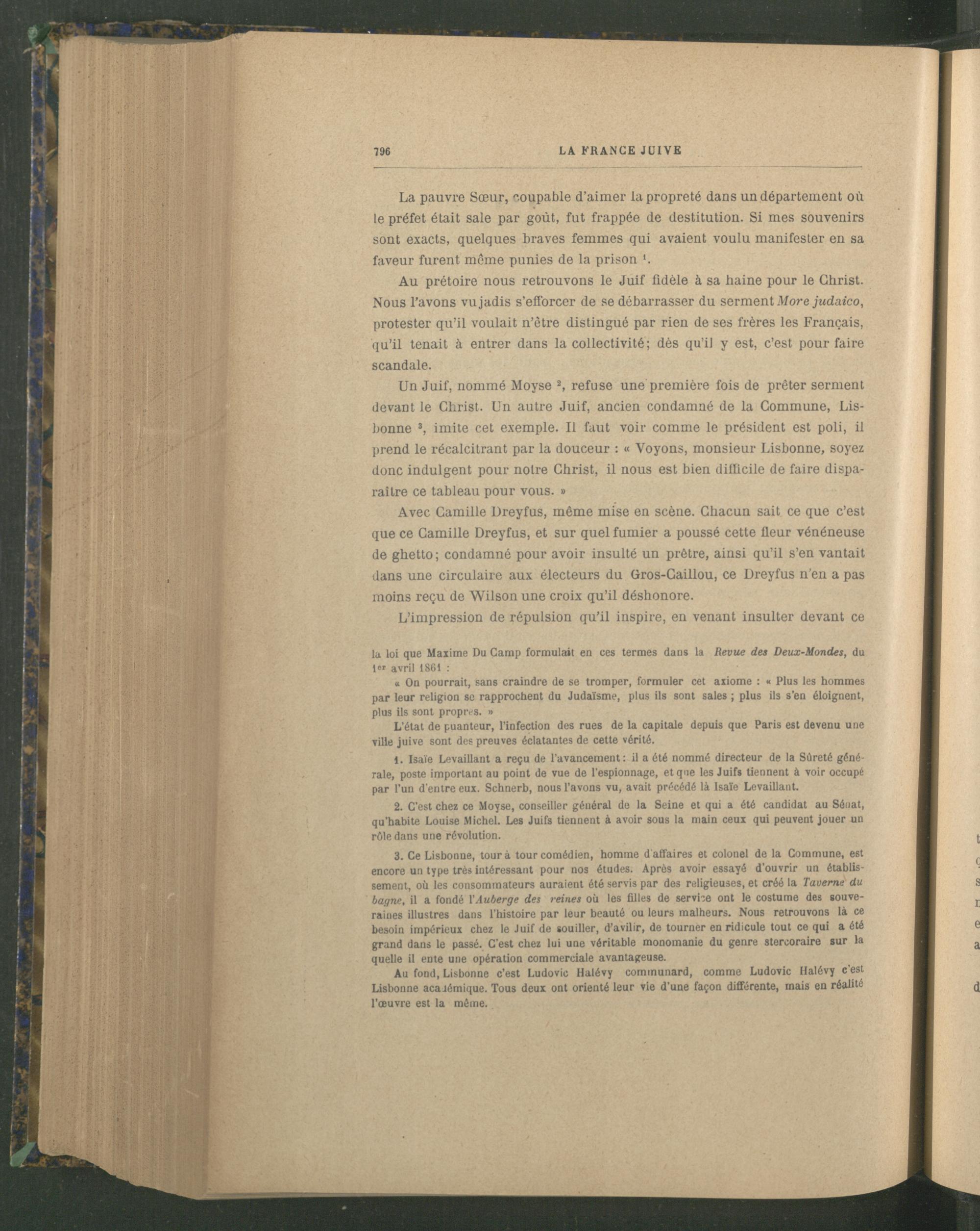 3. Ce Lisbonne , tour à tour comédien, homme d'affaires et colonel de la Commune, est encore un type très intéressant pour nos études. Après avoir essayé d’ouvrir un établissement, où les consommateurs auraient été servis par des religieuses, et créé la Taverne du bagne, il a fondé l 'Auberge des reines où les filles de service ont le costume des souveraines illustres dans l’histoire par leur beauté ou leurs malheurs. Nous retrouvons là ce besoin impérieux chez le Juif de souiller, d’avilir, de tourner en ridicule tout ce qui a été grand dans le passé. C’est chez lui une véritable monomanie du genre stercoraire sur la quelle il ente une opération commerciale avantageuse.