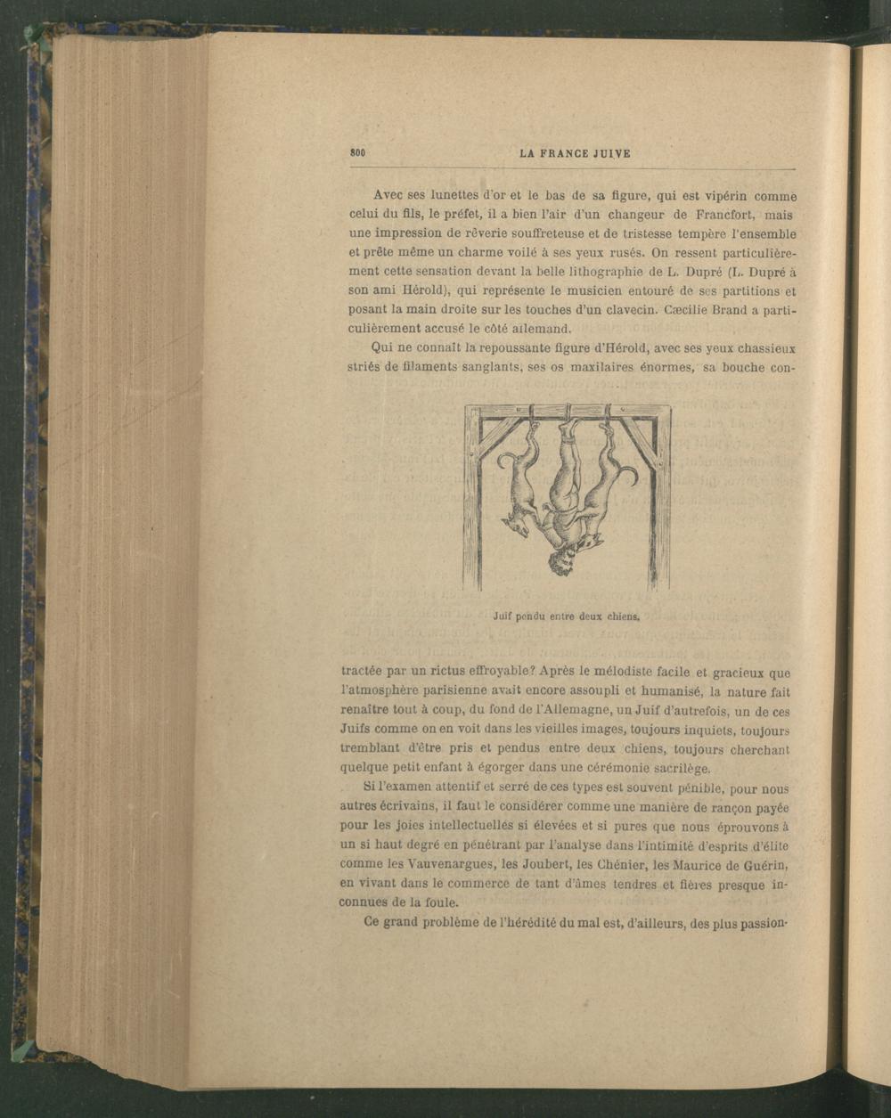 tractée par un rictus effroyable? Après le mélodiste facile et gracieux que l'atmosphère parisienne avait encore assoupli et humanisé, la nature fait renaître tout à coup, du fond de l’Allemagne , un Juif d’autrefois, un de ces Juifs comme on en voit dans les vieilles images, toujours inquiets, toujours tremblant d’être pris et pendus entre deux chiens, toujours cherchant quelque petit enfant à égorger dans une cérémonie sacrilège.