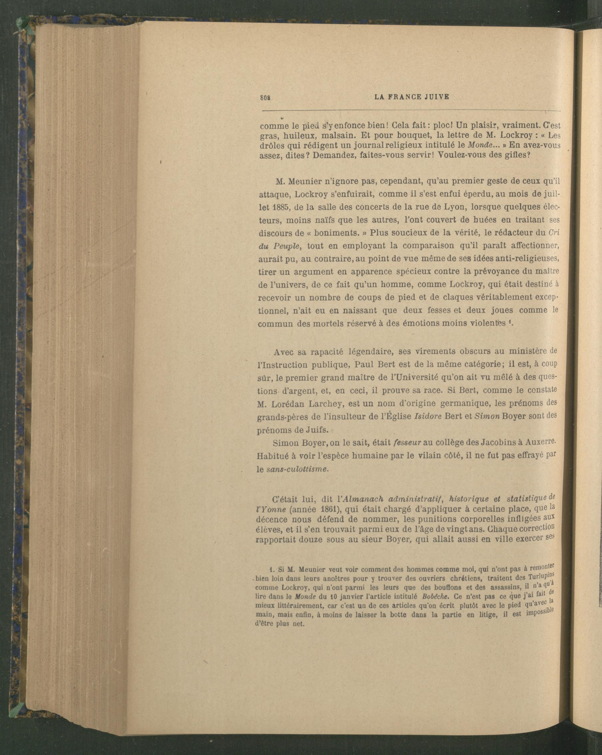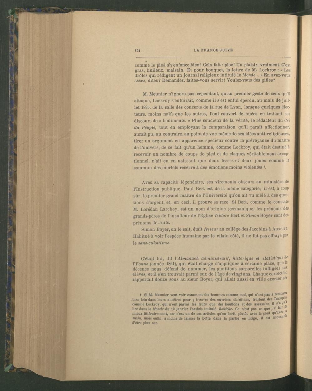 Avec sa rapacité légendaire, ses virements obscurs au ministère de l’Instruction publique, Paul Bert est de la même catégorie; il est, à coup sûr, le premier grand maître de l’Université qu’on ait vu mêlé à des questions d’argent, et, en ceci, il prouve sa race. Si Bert, comme le constate M. Lorédan Larchey , est un nom d’origine germanique, les prénoms des grands-pères de l’insulteur de l’Église Isidore Bert et Simon Boyer sont des prénoms de Juifs.
