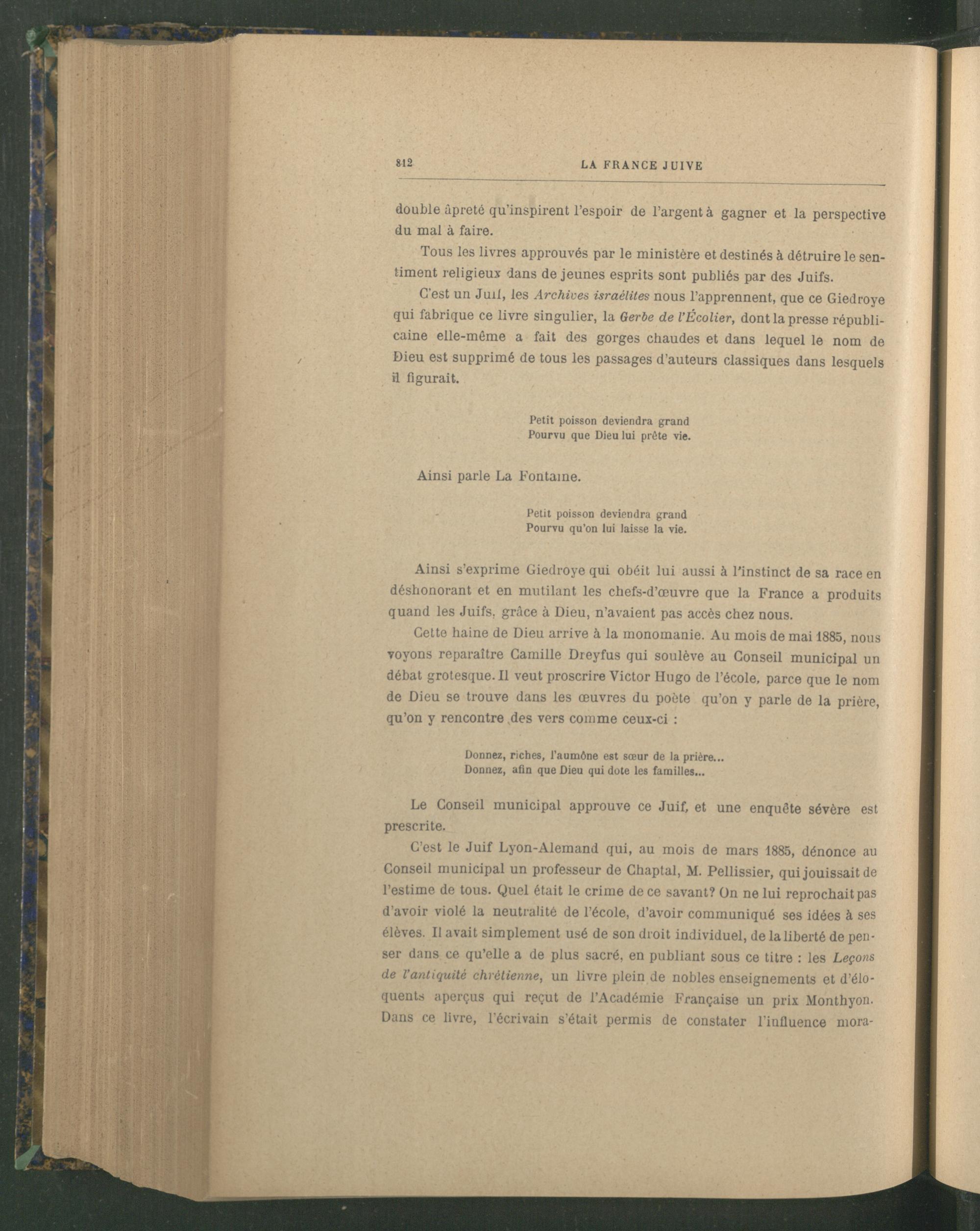 C’est un Juif, les Archives Israélites nous l’apprennent, que ce Giedroye qui fabrique ce livre singulier, la Gerbe de l’Écolier, dont la presse républicaine elle-même a fait des gorges chaudes et dans lequel le nom de Dieu est supprimé de tous les passages d’auteurs classiques dans lesquels il figurait.