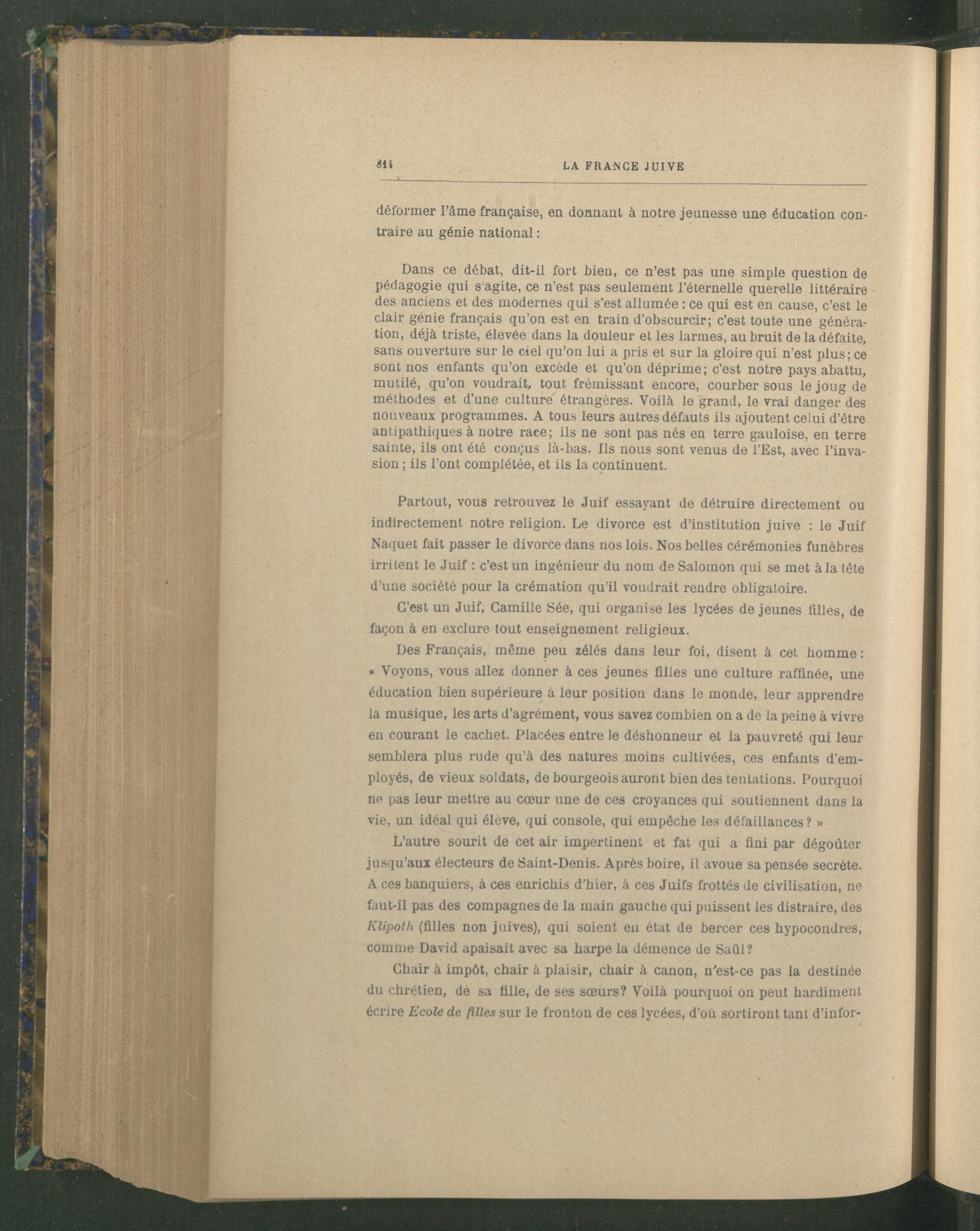 L’autre sourit de cet air impertinent et fat qui a fini par dégoûter jusqu’aux électeurs de Saint-Denis . Après boire, il avoue sa pensée secrète. A ces banquiers, à ces enrichis d'hier, à ces Juifs frottés de civilisation, ne faut-il pas des compagnes de la main gauche qui puissent les distraire, des Klipoth (filles non juives), qui soient en état de bercer ces hypocondres, comme David apaisait avec sa harpe la démence de Saül ?