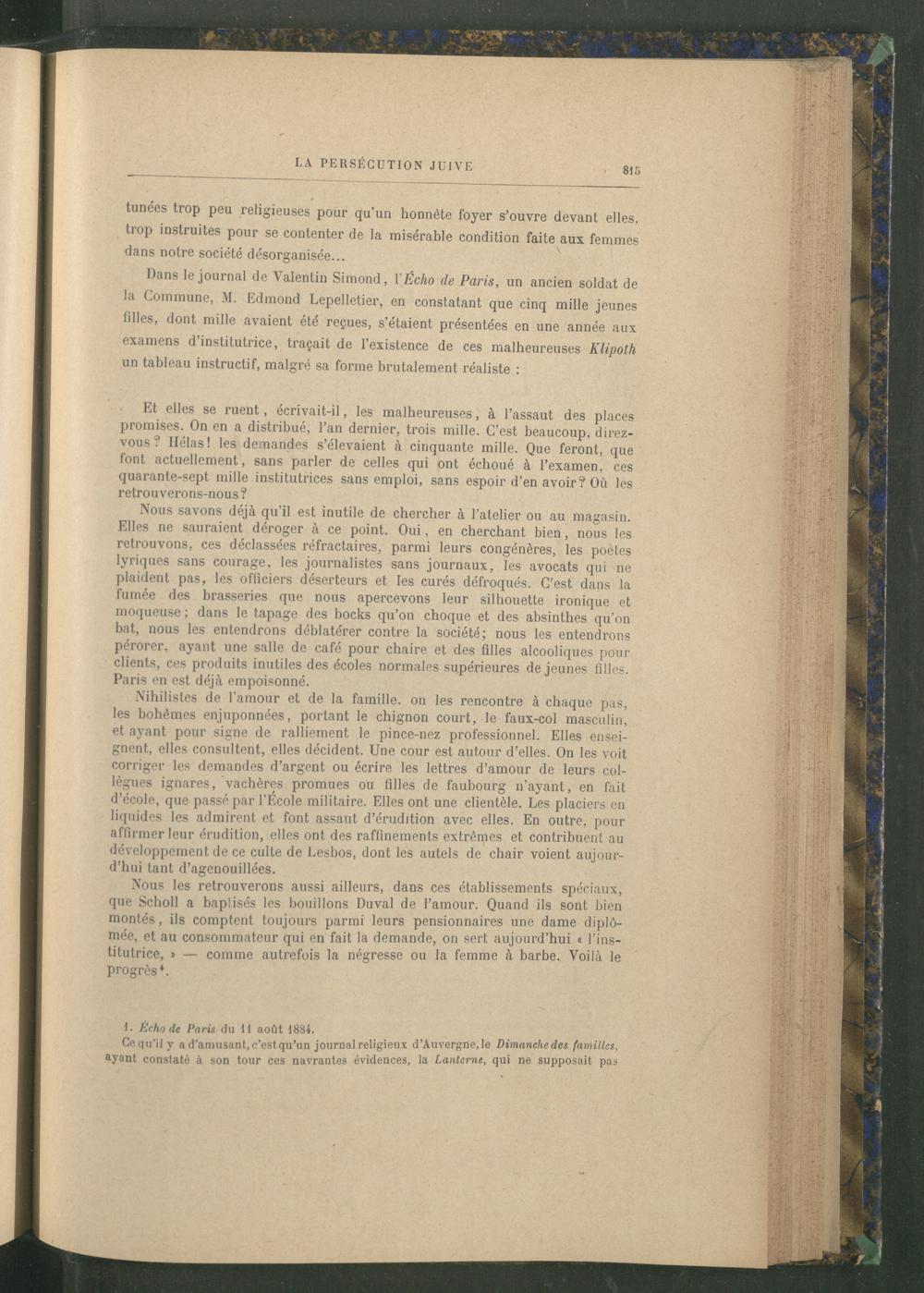 Dans le journal de Valentin Simond, l'Écho de Paris, un ancien soldat de la Commune, M. Edmond Lepelletier , en constatant que cinq mille jeunes filles, dont mille avaient été reçues, s’étaient présentées en une année aux examens d’institutrice, traçait de l’existence de ces malheureuses Klipoth un tableau instructif, malgré sa forme brutalement réaliste :